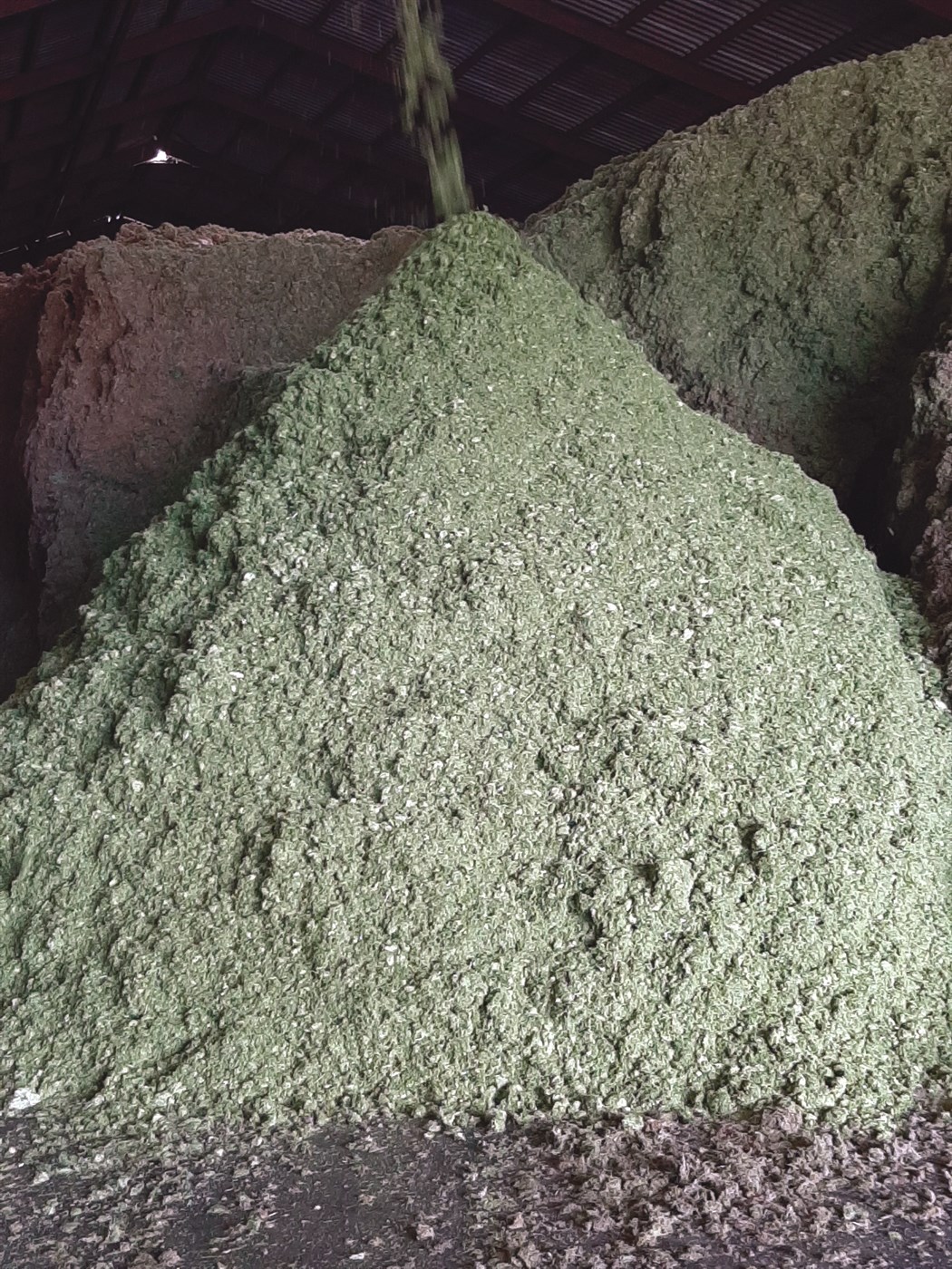 Trefjunum er safnað saman í skemmu hjá Biorefine og þær síðan færðar í lífgasframleiðslu.