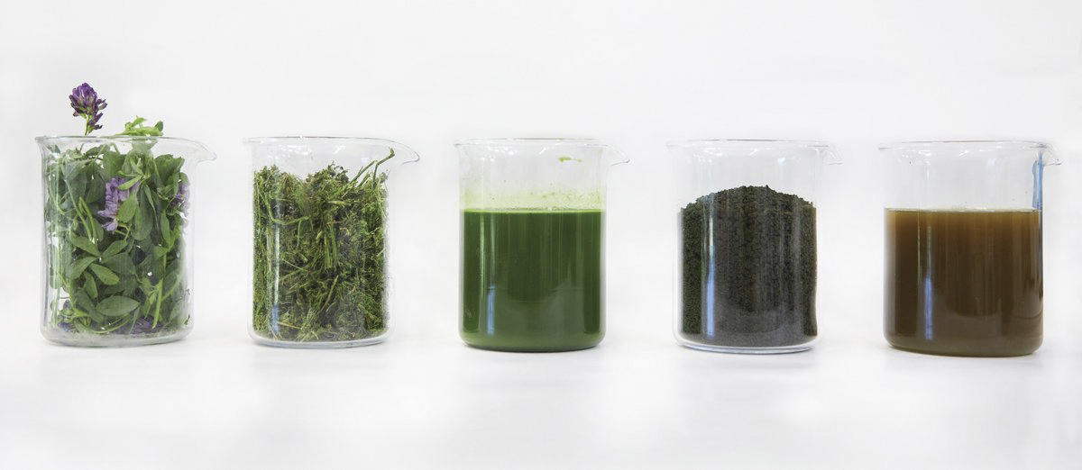 Myndin sýnir upprunalegan efniðvið (refasmára) og afurðir úr vinnslunni sem eru trefjarnar, grænn safi, próteinið, fyrir þurrkun, og brúnn safi. Mynd / Ida Marie Jenssen