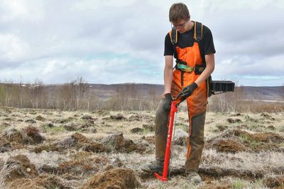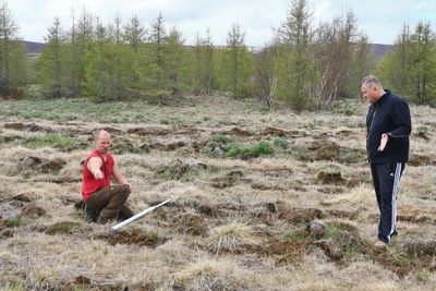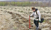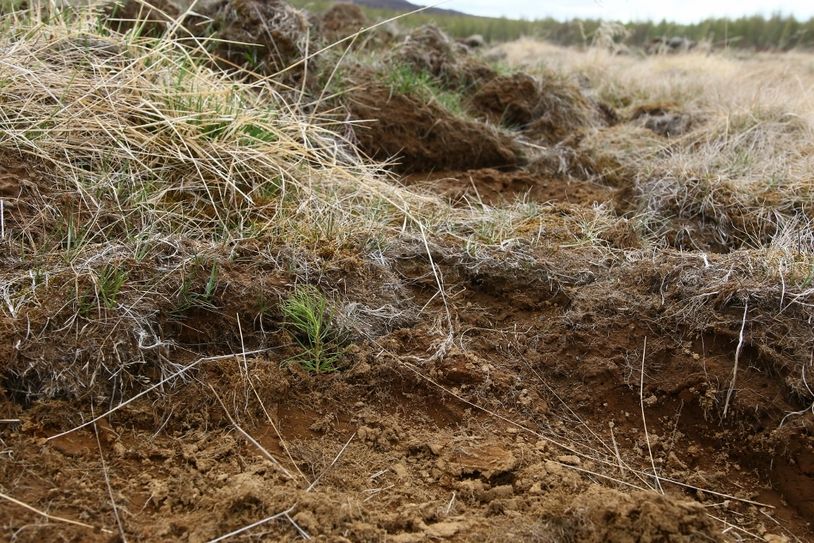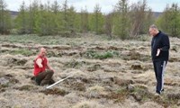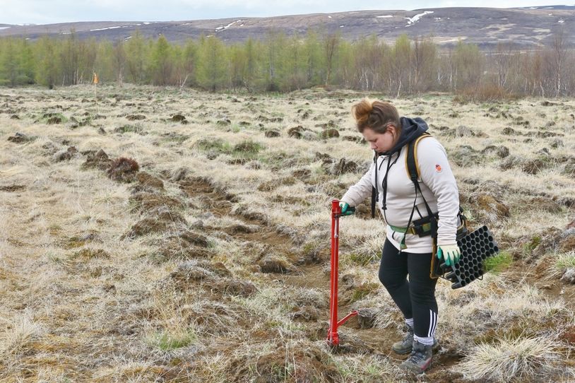 Erna Sigrún Valgeirsdóttir gróðursetur stafafuru af sænska frægarðayrkinu Opphala í jarðunnið land á Hálsmelum í Fnjóskadal. Gróðursetning hófst 15. maí, fyrr en vitað er um áður þar um slóðir.