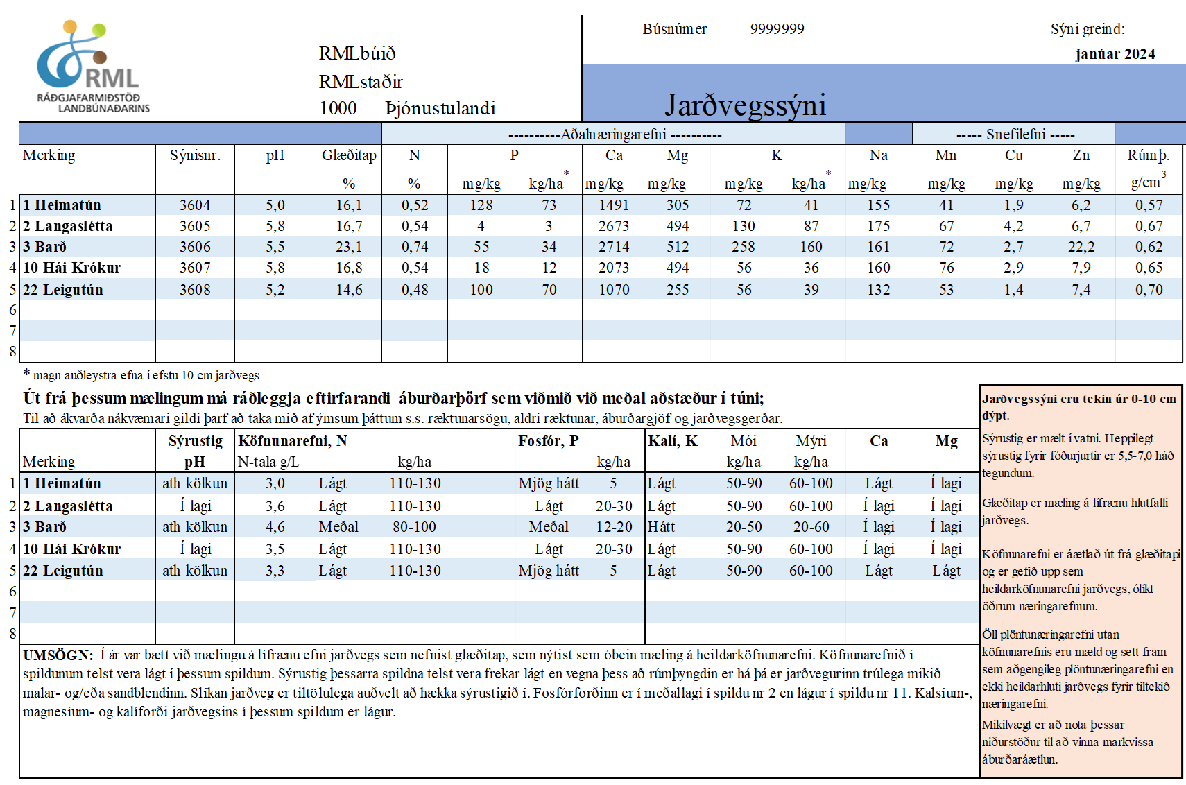 RML sendir frá sér túlkunarblað til hvers og eins bónda sem lét RML taka jarðvegssýni þar sem niðurstöðurnar eru teknar saman og túlkaðar . Einnig eru niðurstöðurnar settar fram með myndrænum hætti til að sýna mismuninn á milli sýnanna sem tekin voru á búinu og einnig sýnt hvernig þær koma út í samanburði við sýni sem voru tekin af landinu öllu.