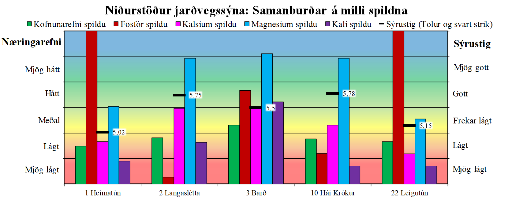 Til athugunar: Hér ber að líta mynd byggða á niðurstöðum jarðvegssýna. Hér er hægt að sjá myndrænt hvar jarðvegssýnin standa innbyrðis á milli spildna. Bæði fyrir steinefnin (súlurnar) og fyrir sýrustigið (svart strik) sem spildurnar hafa. Tölurnar sem eru settar fram við svörtu strikin tákna sýrustig spildnanna og má bera þær tölur saman við flokkana á hægri væng myndarinnar. Súlurnar eru fyrir köfnunarefni, fosfór, kalsíum, magnesíum og kalí og má bera þær saman við flokkana á vinstri væng myndarinnar. Köfnunarefni spildu getur aðeins verið á bilinu lágt-meðal-hátt.