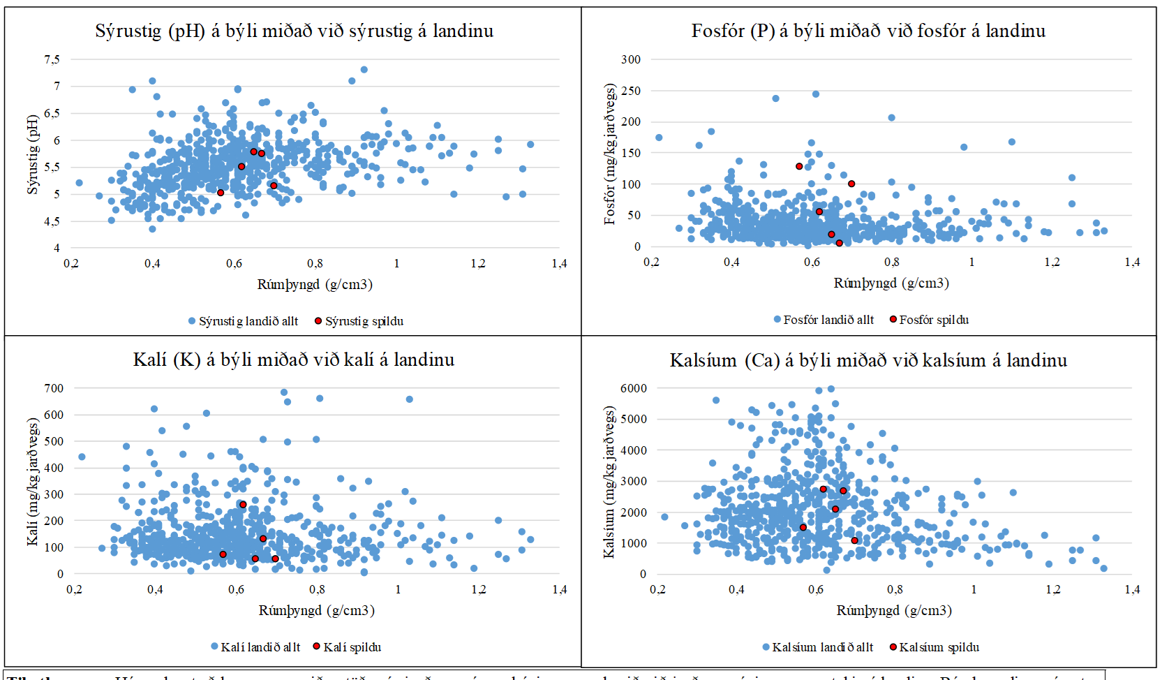 Til athugunar: Hér er hægt að bera saman niðurstöður úr jarðvegssýnum búsins samanborið við jarðvegssýni sem voru tekin á landinu. Rúmþyngdina má nota til þess að áætla jarðvegsgerð. T.d. eru mýrar með lága rúmþyngd (0,2 - 0,5 g/cm3) meðan sendin tún eru með háa rúmþyngd (0,8 - 1,4 g/cm3).