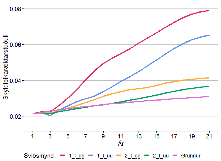 Mynd 2 sýnir þróun skyldleikaræktarstuðuls í stofninum í fjórum sviðsmyndum riðumótstöðuræktunar og í grunnsviðsmyndinni til samanburðar. Allar sviðsmyndir riðumótstöðuræktunar leiddu til meiri skyldleikaræktar en hefðbundin ræktun. Skyldleikaræktin var afgerandi meiri í sviðsmyndum þar sem allur stofninn lagði áherslu á innleiðingu ARR en í sviðsmyndum þar sem áherslan var meiri á riðusvæðum en á öðrum svæðum. Sviðsmyndir þar sem hrútar voru endurnýjaðir hratt leiddu til minni skyldleikaræktaraukningar en sviðsmyndir þar sem endurnýjun hrúta var hefðbundin. Mynd 3 sýnir virka stofnstærð á árum 1 til 15 af riðumótstöðuræktun fyrir fjórar sviðsmyndir ásamt grunnsviðsmyndinni. Í öllum sviðsmyndum minnkaði virk stofnstærð við riðumótstöðuræktun í samanburði við grunninn. Lægsta virka stofnstærðin var 86 sem er þó vel yfir 50 sem mælt er með sem algeru lágmarki af Matvælastofnun Sameinuðu þjóðanna. Niðurstöðurnar sýndu að hraðari endurnýjun hrúta eykur virka stofnstærð og eru áhrifin sérstaklega greinileg í sviðsmyndum þar sem innleiðing ARR fer hratt fram í öllum stofninum.