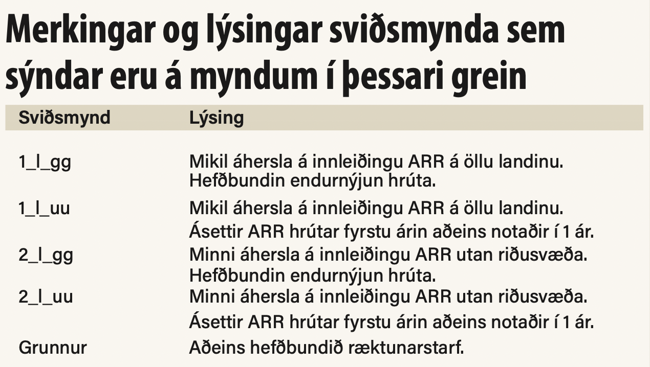 Í öllum sviðsmyndum báru nánast allar kindur minnst eina ARR-samsætu eftir 20 ár af riðumótstöðuræktun og á riðusvæðum eftir 9 ár. Á mynd 1 sést þróun arfgerðahlutfalla ærstofnsins í fjórum af sviðsmyndum rannsóknarinnar. Eftir 20 ár af riðumótstöðuræktun er hlutfall arfhreinna ARR-gripa að nálgast 100% í sviðsmyndum þar sem allur stofninn leggur áherslu á innleiðingu en er á bilinu 50-70% í sviðsmyndum þar sem minni áhersla er utan riðusvæðanna.