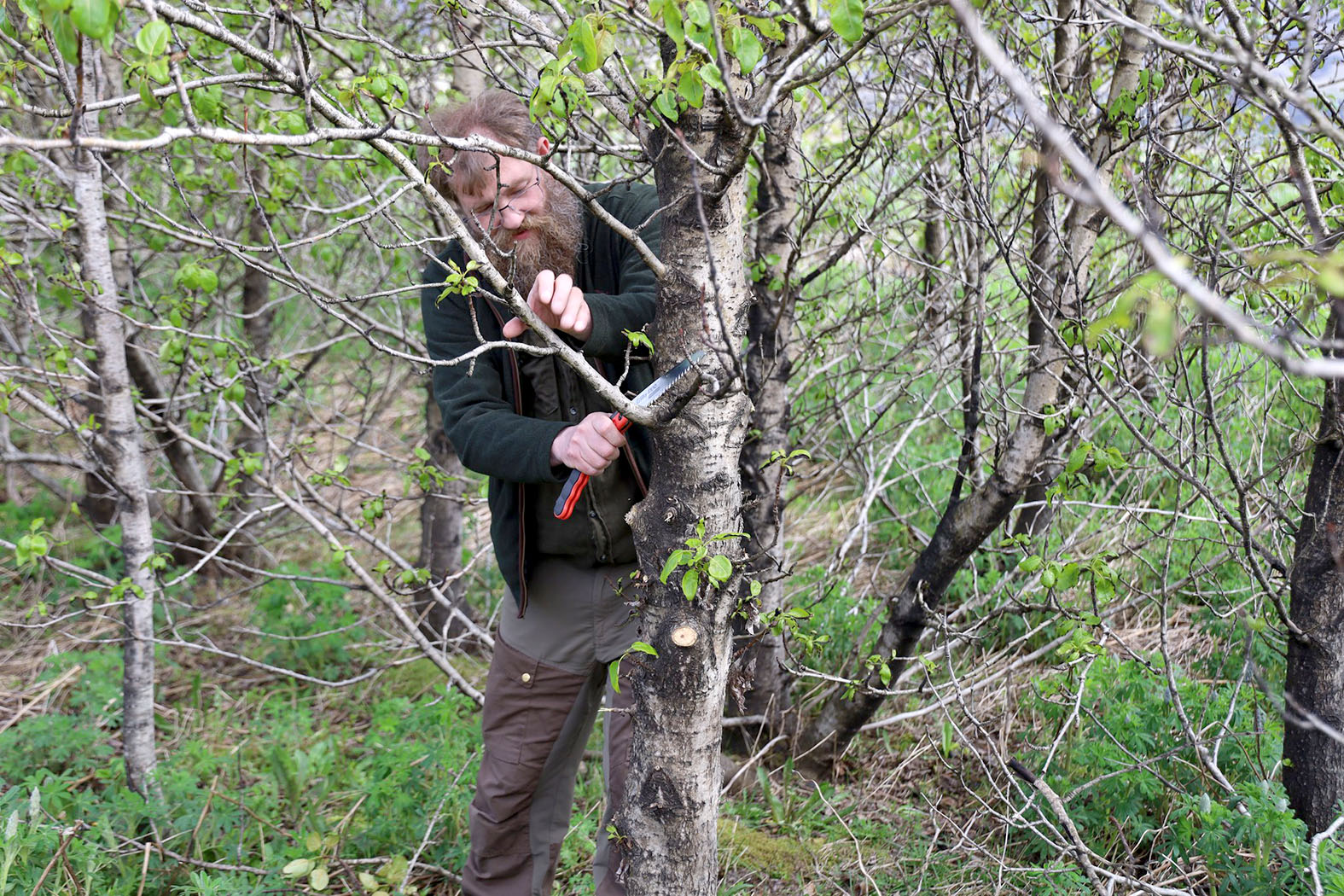 Þegar komið var í Hólsgerði tóku Brynjar og Sigríður á móti hópnum og buðu upp á ketilkaffi á meðan þau sögðu frá bænum, sögu hans, rekstri og umhverfis- og loftslagsaðgerðum. Brynjar er menntaður skógfræðingur og hefur mikla þekkingu ásamt reynslu af skógrækt, sem hann miðlaði til þátttakenda. Hann kynnti allt ferli skógræktar, s.s. gróðursetningu, áburðargjöf, umhirðu og nýtingu skógarafurða, en þau hjónin eru m.a. að undirbúa að klæða íbúðarhúsið á jörðinni með veggskífum úr trjám sem þau hafa ræktað.