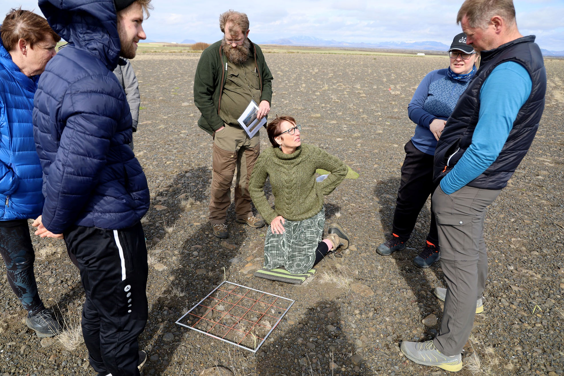 Síðan var farið á Geitasand á Rangárvöllum þar sem fjallað var um áhrif ólíkra tegunda og samsetningar af lífrænum áburði á uppgræðslu, en þar eru í gangi tilraunir þar sem borin eru saman áhrif mismunandi lífrænna efna á gróðurframvindu á rýrum mel.