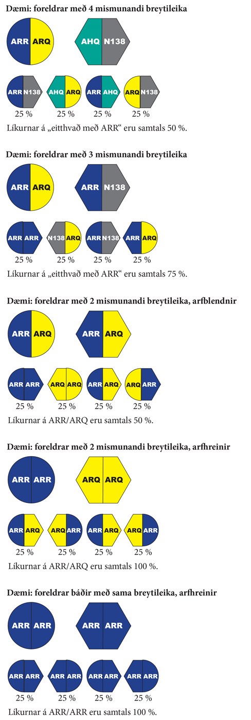 Yfirlitsmyndin sýnir þetta á glöggan hátt fyrir alla möguleika sem eru hugsanlegir. Þessa mynd er hægt að nota á allar arfgerðir – bara skipta arfgerðunum út eftir vild, bara passa að yfirskriftin sé rétt: nota „þrjár mismunandi arfgerðir“ til dæmis ef um T137, AHQ og ARQ er að ræða – eða C151, ARQ og VRQ eða aðrar 3 arfgerðir/breytileika.