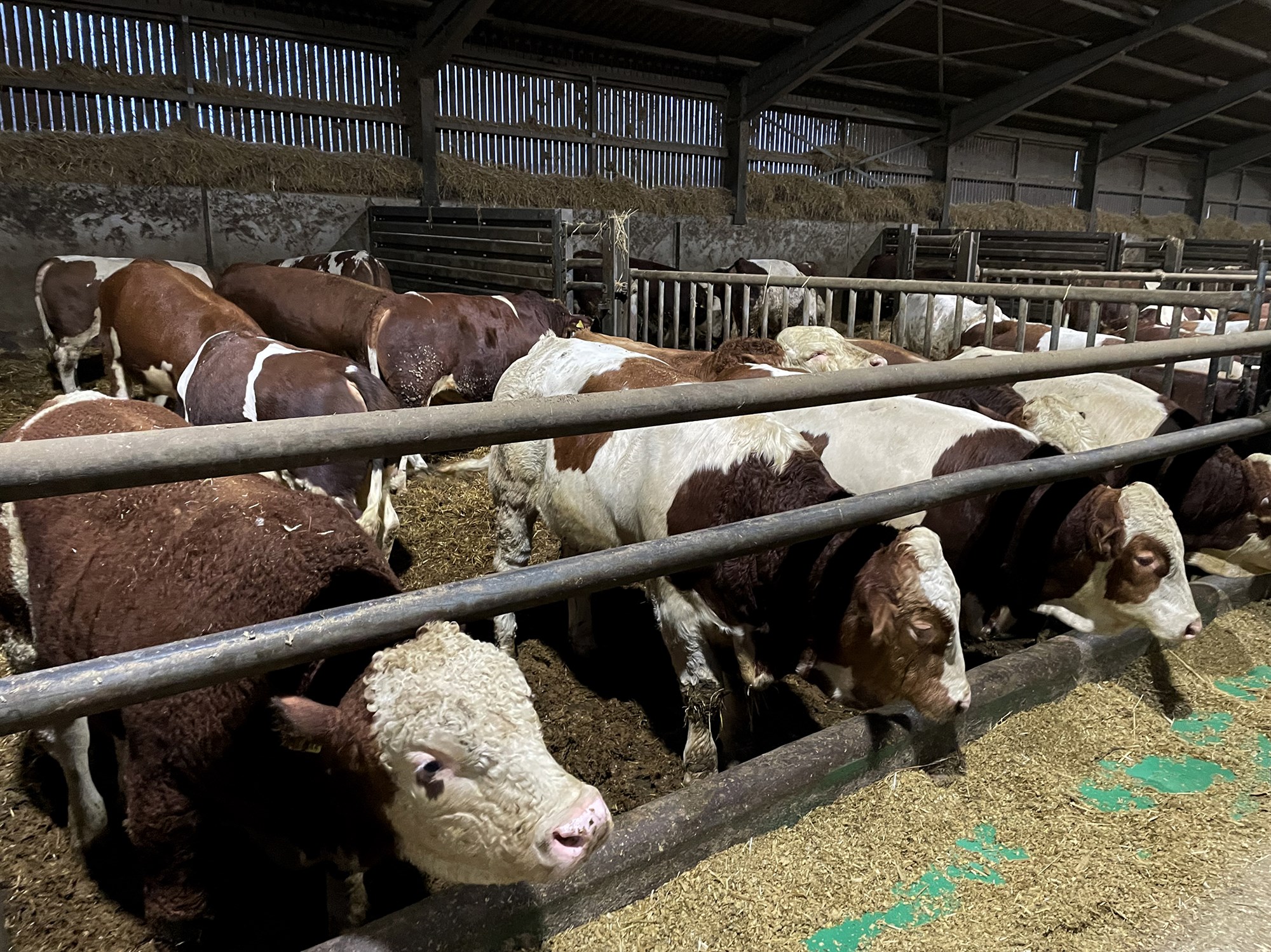 Fjósið er afar einfalt hjá Christoph, með fóðurgangi í miðju og stíum til beggja handa. Það vakti athygli hve hrein nautin voru, en skýringin var sú að stíurnar eru hálmstíur sem halda nautunum bæði þurrum og hreinum. Stíurnar eru þannig útbúnar að legusvæði nautanna er með 3% hallandi gólfi, en átsvæðið lárétt slétt og aðeins neðar en legusvæðið. Tvisvar í viku er hálmi blásið upp í legusvæðið og nautin sjá svo um að ýta hálminum hægt og bítandi niður á slétta svæðið fyrir framan átgrindina. Fyrir vikið hleðst hálmurinn ekki upp á legusvæðinu og er yfirleitt í kringum 20 cm þykkur að sögn Christoph. Hann mokar svo flórinn við átsvæðið tvisvar í viku og þegar það er gert, lokar hann nautin inni á legusvæðinu sjálfu og getur því athafnað sig auðveldlega á mokstursvél. Fram kom að hann notar 1.200 hálmrúllur, 180 cm stórar, á ári undir nautin.
