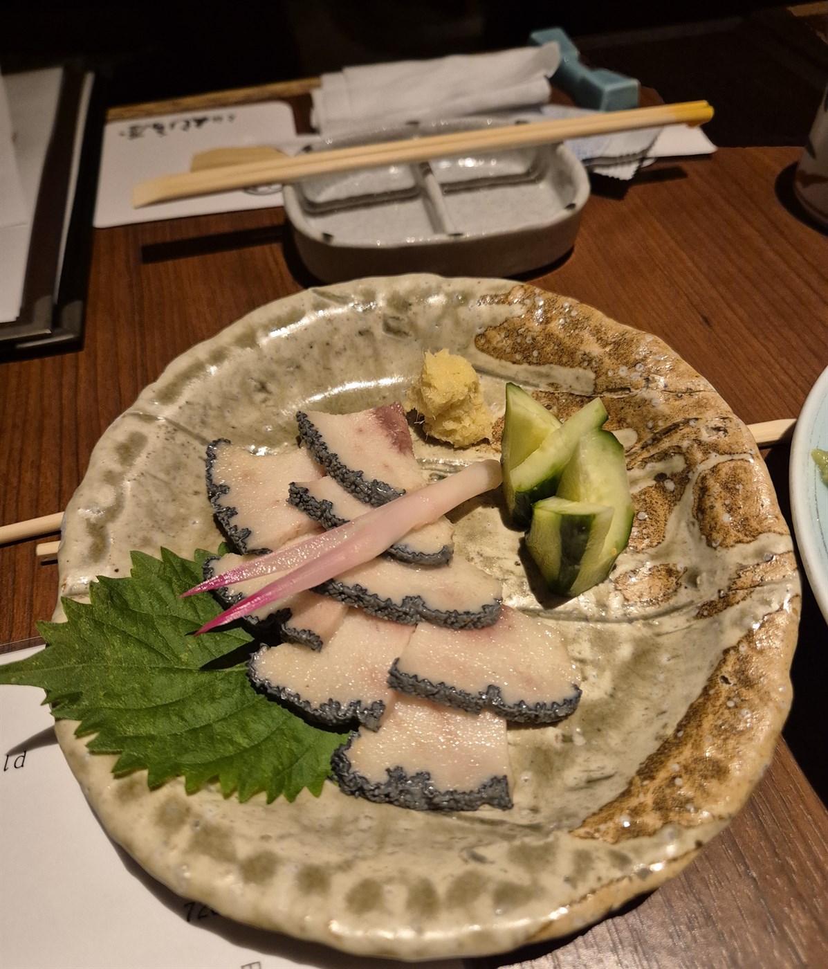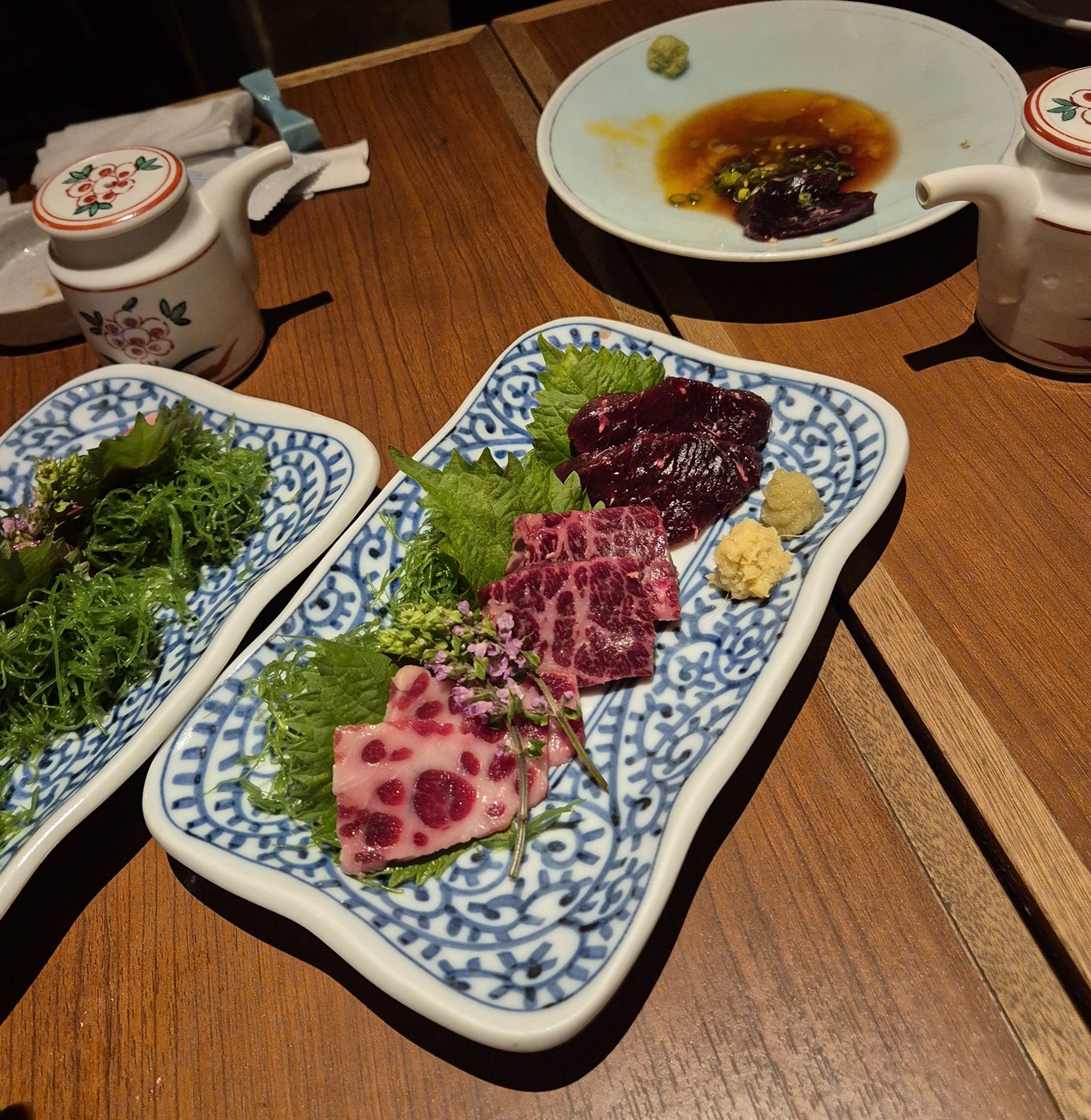 Hvalkjötið var aðallega borið fram hrátt, sem japanskt sashimi. Fyrstu þrír réttirnir voru hrá lund með hrárri eggjarauðu, hrá síða (beikon) og hrá tunga. Með öllu þessu kjöti var borin fram sojasósa ásamt wasabi kryddi, hvítlauk og ferskum kryddjurtum. Lundin var einstaklega mjúk og bragðgóð og fór vel með hrárri eggjarauðu. Einfaldleikinn er bestur, að mínu mati. Kinnin var vel fitusprengd og örlítið seigari undir tönn. Samt var hún mjúk og góð, dýft í sojasósu með wasabi. Síðan var síst af réttunum. Hún var að sjálfsögðu feit en frekar seig undir tönn og ekki eins og ég reiknaði með.
