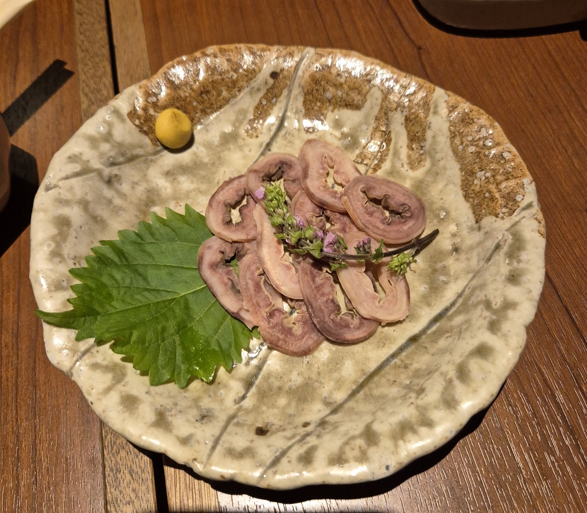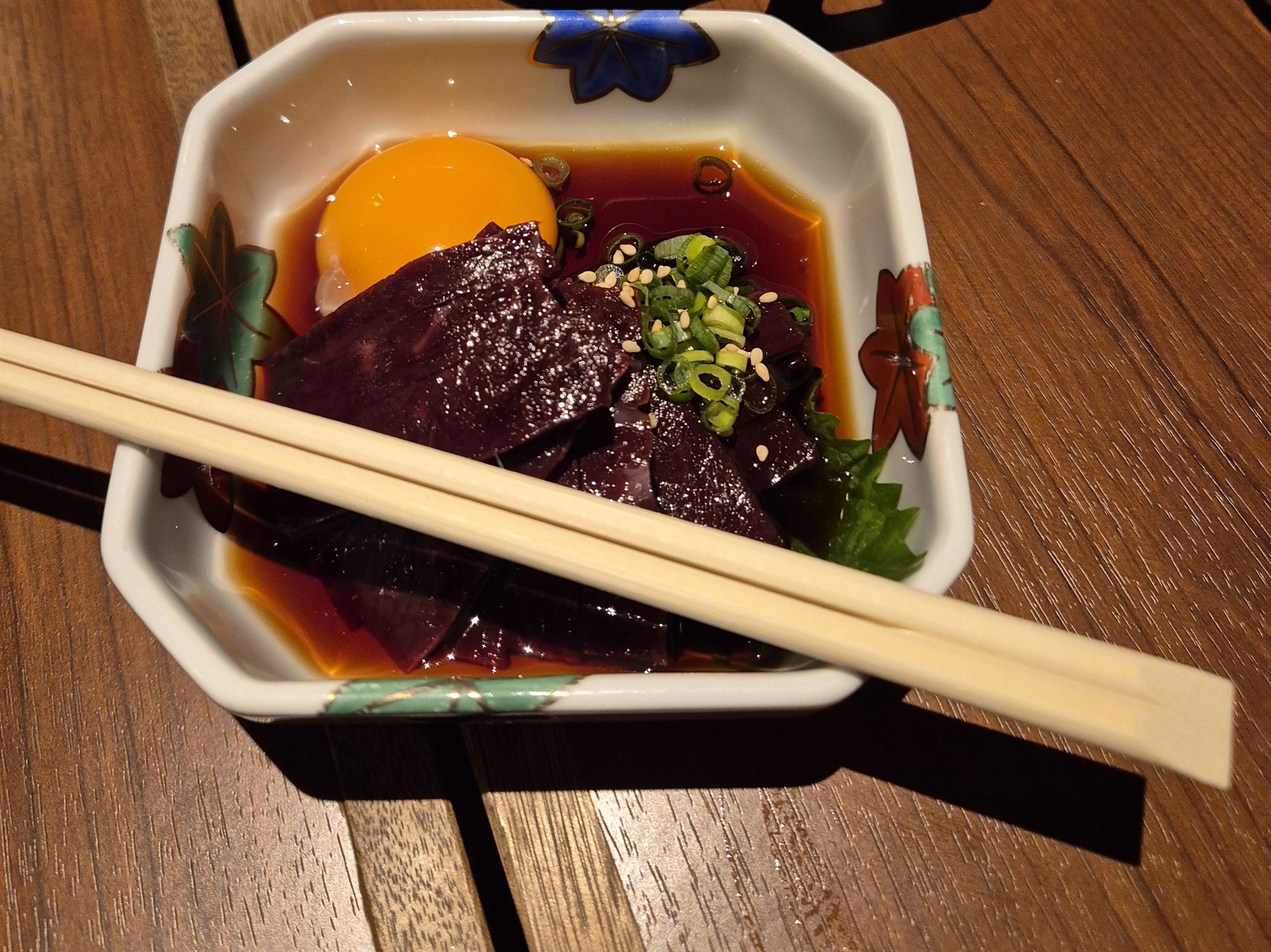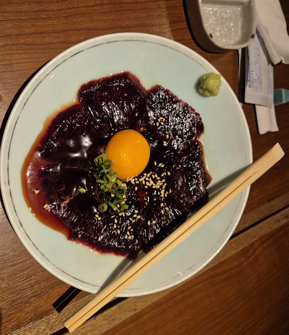 Næstu réttir voru hrátt hjarta með hrárri eggjarauðu, léttsteiktur hryggjarbiti og hrátt skinn. Hjartað var frábært og alveg eins og ég reiknaði með, ekki ósvipað bit og í íslensku lambahjarta, sem ég borða oft, léttsteikt. Þjónninn mælti með að við myndum krydda hjartað með krömdum hráum hvítlauk. Það var frábær lystauki. Léttsteikti hryggurinn var eins og ég hafði fengið áður, lungamjúkur og afar bragðgóður. Hvort heldur í safanum af sjálfum sér eða með örlítilli sojasósu og wasabi.