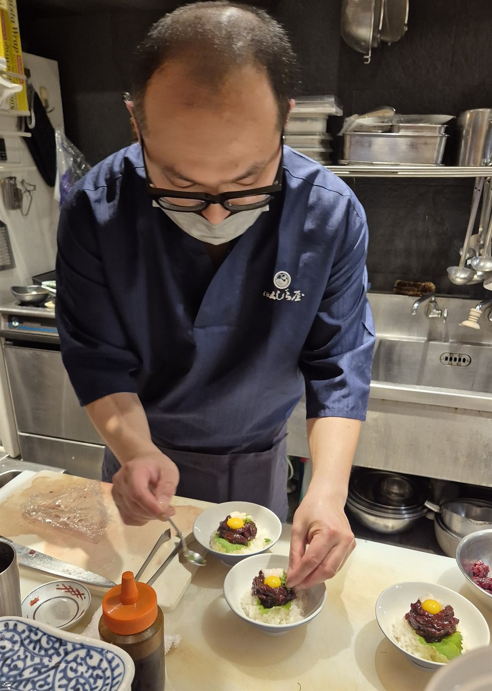 Einkenni Japana er hreinlæti. Þeir fara alltaf úr skónum þegar þeir koma inn í hús og fara í inniskó. Á flestum fínni veitingastöðum er það þannig, gestir fara úr útiskónum og fara í hreina inniskó. Það var þó ekki þannig á þessum veitingastað. En kokkarnir og þjónarnir þurfa að bera grímu vegna hreinlætiskrafna. Þeir máttu því ekki taka þær ofan til að ég fengi að taka myndir af þeim.