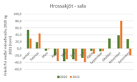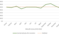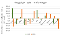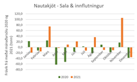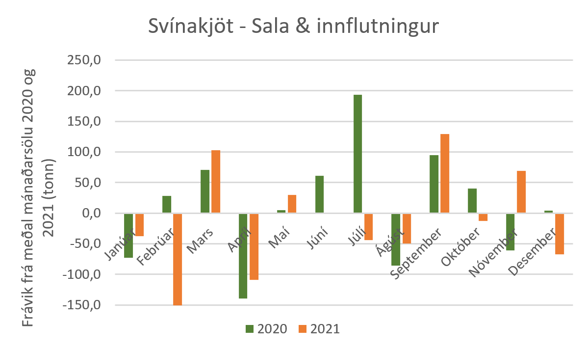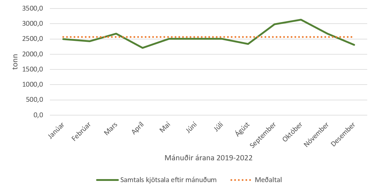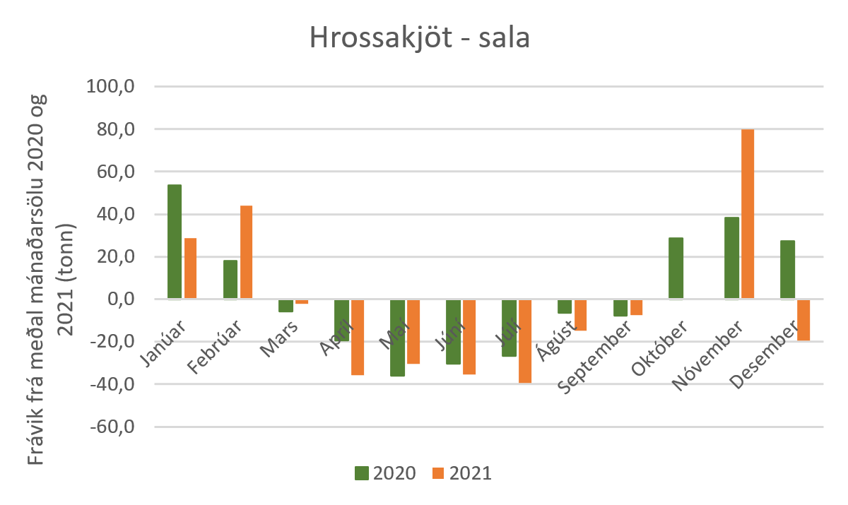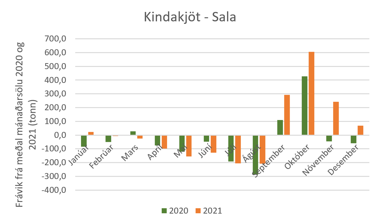 Einnig er áhugavert að sjá að ekki er hægt að treysta á að sala svínakjöts eða kindakjöts aukist í desember. Hér er stuðst við sölu áranna 2020 og 2021 og sést þá að árið 2020 var kindakjötssala í desember rétt undir meðaltali en árið 2021 var hún rétt yfir meðaltali. Öfugt er farið með svínakjötið. Þar er salan rétt yfir meðaltali árið 2020 en undir því 2021. Þegar horft er yfir töflur sem sýna frávik frá meðal mánaðarsölu sést að fyrir utan lambakjöts- og hrossakjötssölu rétt eftir sláturtíð á haustin, og samdrátt í mánuðunum fram að því, er lítið hægt að reiða sig á árstíðabundna söluaukningu í einstaka kjötflokkum, þó fyrir utan það að í desember áranna tveggja í þessu úrtaki dró úr sölu bæði alifugla- og nautakjöts.