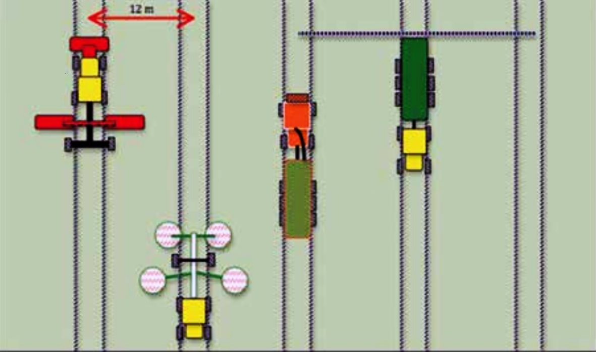 Skýringarmynd 3. Þegar keyrsluspor í túnum eru hönnuð þarf að horfa til þeirra tækja sem nota á og reikna út heppilegustu staðsetningu sporanna miðað við vinnslubreidd tækjanna. Mynd / Julie Wiik