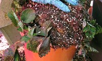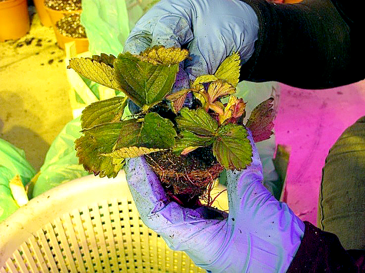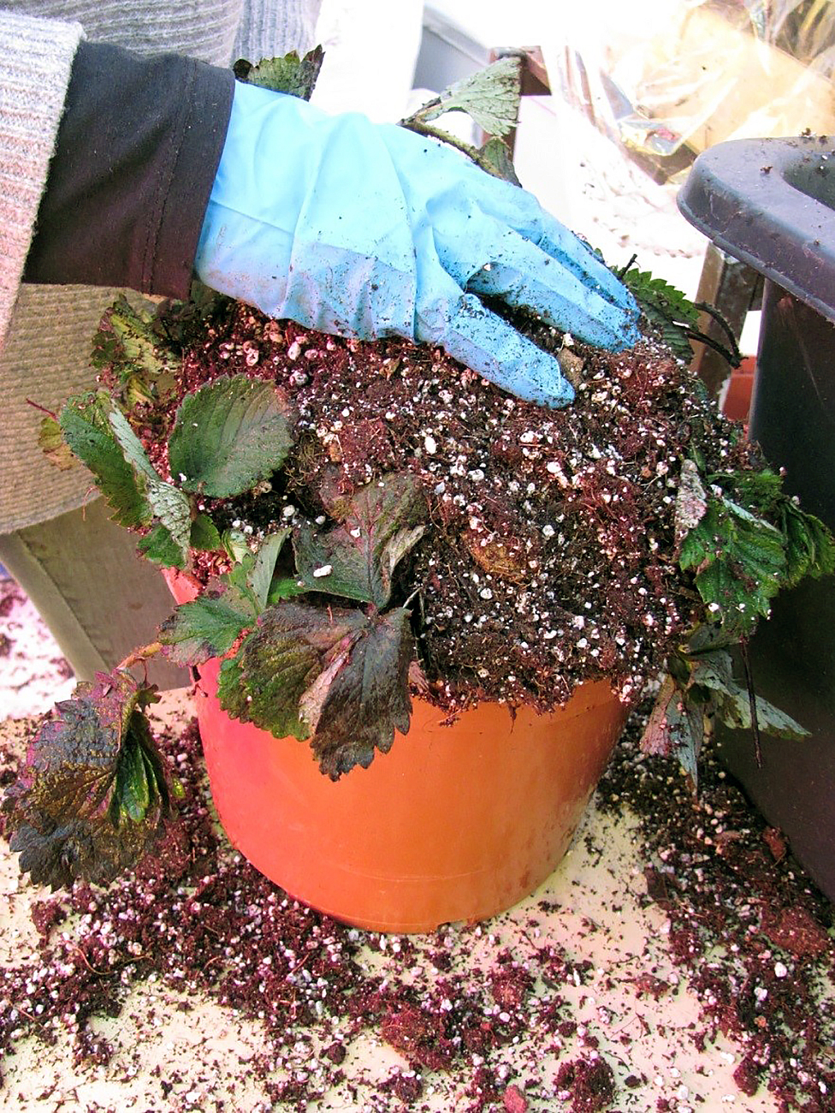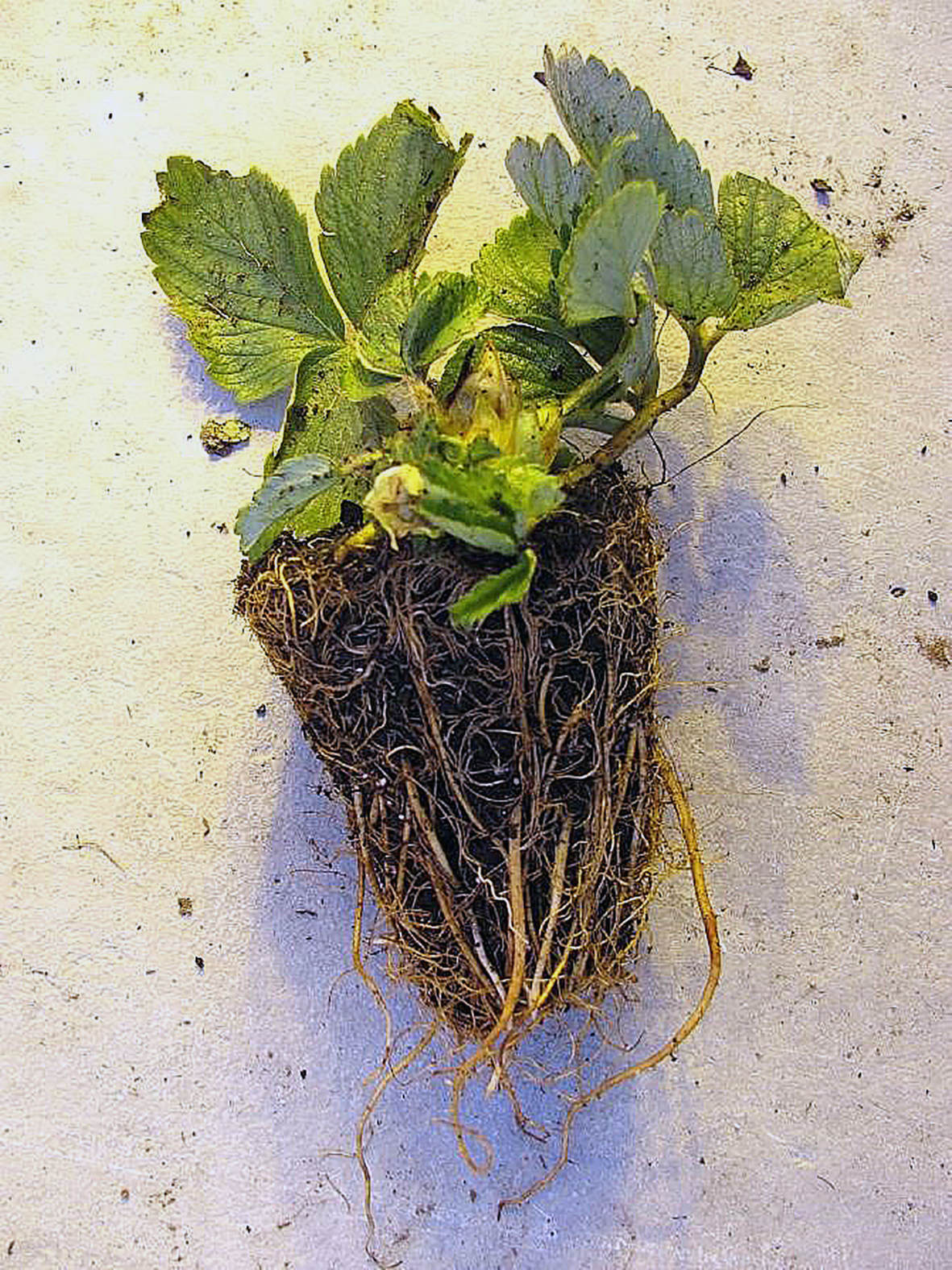 Gott er að fjárlægja skemmd blöð af plöntunum fyrir gróðursetningu til að fyrirbyggja sveppasjúkdóma (Mynd 1). Það þarf að hafa í huga þegar ræktunarefni er valið að gegnum rennslið sé gott fyrir rætunar og sýrustigið sé um pH 5,5–6,0. Í jarðarberjaræktun er æskilegast að vera með moldarblöndu sem inniheldur nokkuð grófar moldartrefjar (peat) með perlusteini (perlite) en svona ræktunarefni er hægt að nálgast hjá flestum söluaðilum sem þjónusta garðyrkjugreinina.