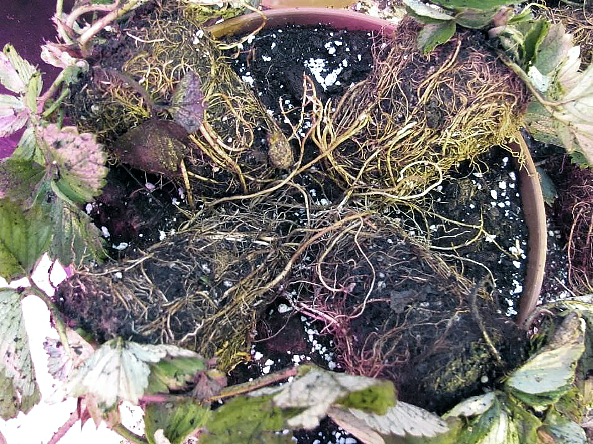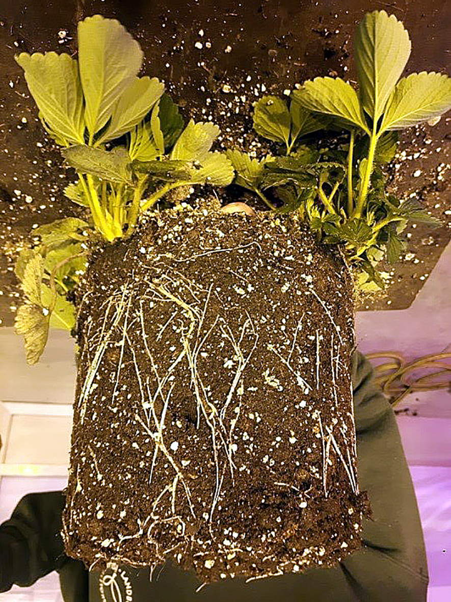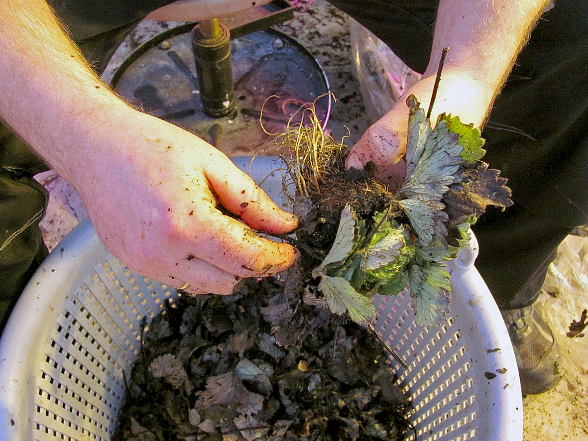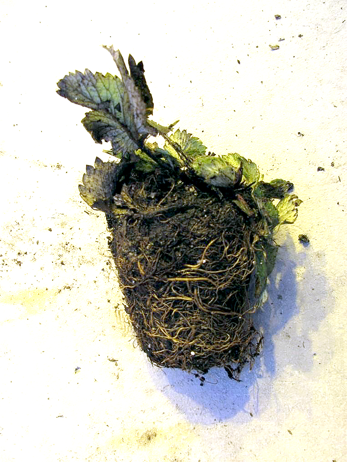 Við útplöntunina er gott að skoða rætur plantnanna vel, því að rætunar eiga að vera ljósar að lit en ekki dökkar, það skiptir máli uppá gæði plantnanna og uppskeru (Mynd 4).