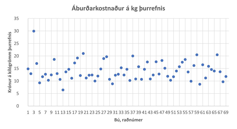 Eitt af því sem gert er fyrir hvert bú í Sprotanum er að reikna og setja fram kostnað vegna áburðarnotkunar miðað við skráða uppskeru. Byggt á þeim tölum er hægt að bera saman bú og sjá hvar hver og einn stendur miðað við aðra þó svo forsendur geti verið ólíkar, sjá meðfylgjandi mynd.