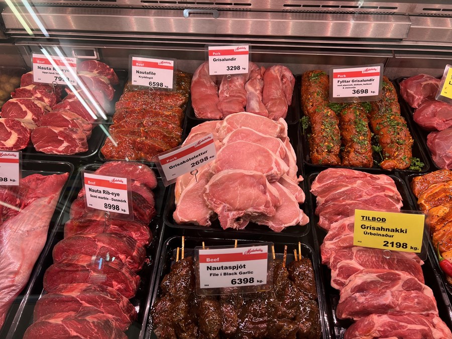 Á fyrstu fjórum mánuðum ársins voru flutt inn 354 tonn af nautakjöti, 868 tonn af svínakjöti og 674 tonn af alifuglakjöti. Sé það borið saman við innlenda framleiðslu er markaðshlutdeild þessara afurða 18,5% fyrir naut, 21% fyrir svín og 18% fyrir alifuglakjöt. Hafa verður þó í huga að megnið af innflutningi er beinlaust en innlend framleiðsla er mæld með þyngd beina. Því má álykta að í raun sé markaðshlutdeild erlends kjöts hærri en hér sést.