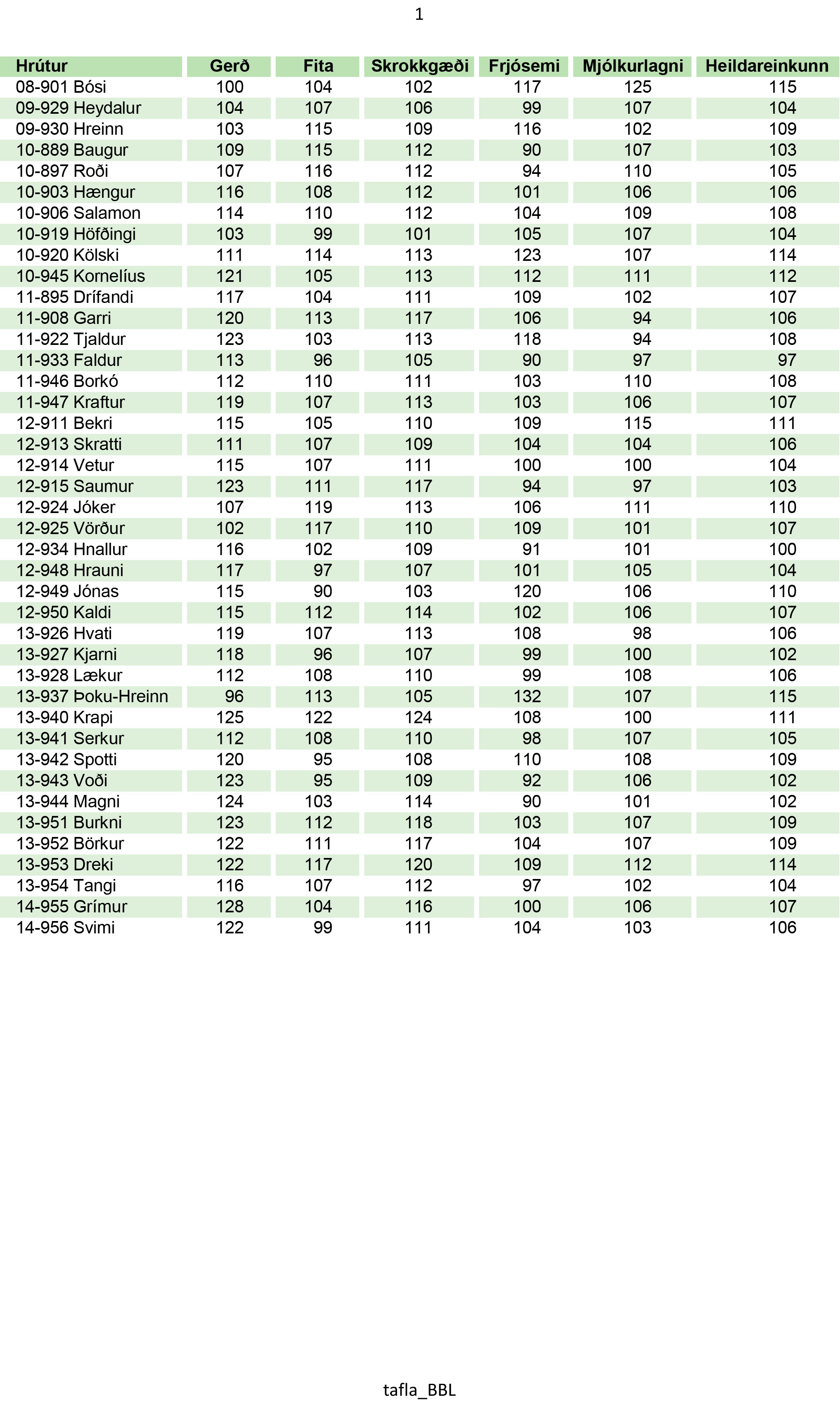 Meðfylgjandi er tafla yfir kynbótamat þeirra hrúta sem voru í notkun á sæðingastöðvunum síðasta vetur. Á heimasíðu RML má finna ítarlegri upplýsingar um þá sæðingastöðvahrúta sem eiga 100 dætur eða fleiri fæddar á árunum 2012–2015 og meðalfrjósemi hvers árgangs.