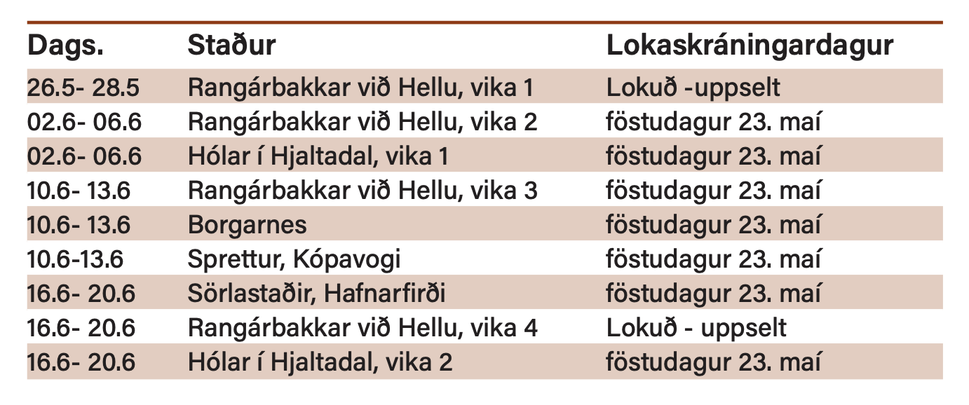 Í meðfylgjandi töflu má sjá hvaða sýningarstaðir eru í boði og lokaskráningardag á hverja sýningu en skráningu þarf að vera lokið á miðnætti þess dags. Ef sýning fyllist lokast sjálfkrafa á sýninguna þó svo skráningarfrestur sé ekki útrunninn. Eigandi/ umsjónamaður hrossins verður þá að velja aðra sýningu. Til að fá aðstoð er hægt að hringja í síma 516-5000, eða senda tölvupóst á netföngin halla@ rml.is og hross@ rml.is. Við bendum á að utan dagvinnutíma eru starfsmenn RML ekki til staðar til að svara síma eða tölvupósti og því hvetjum við eigendur/umsjónamenn hrossa til að skrá tímanlega.