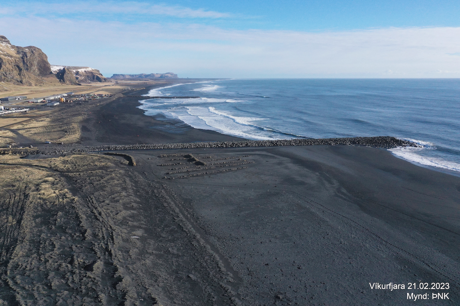 Yfirlitsmynd yfir Víkurfjöru og sandvarnargarða. Sandfok yfir byggðina sést glögglega sem og hversu stutt er úr fjöru í byggðina.