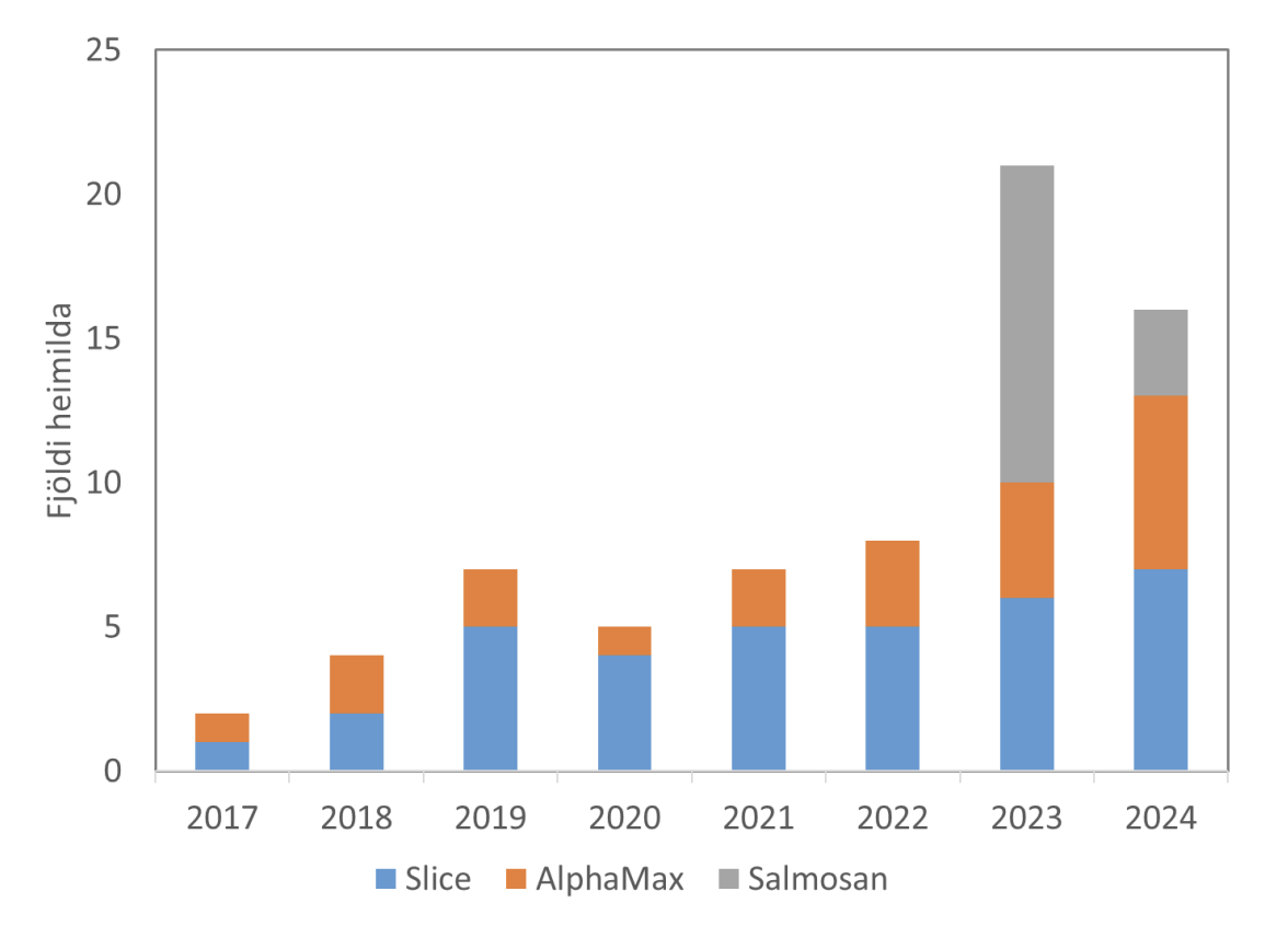 Mynd 1. Fjöldi heimilda fisksjúkdómanefndar til sjókvíaeldisfyrirtækja á Vestfjörðum um notkun laxalúsalyfja við aflúsun á eldisfiski. Í sumum tilvikum nær heimildin til notkunar á tveimur lúsalyfjum samtímis.