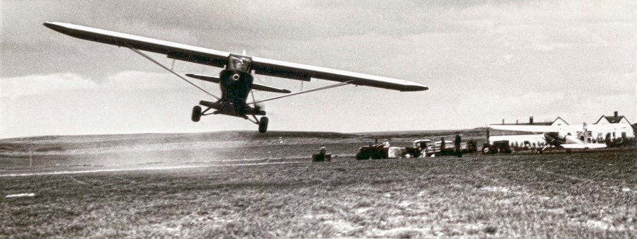 Páll Halldórsson við stýrið á Piper Super Cub og Sveinn Runólfsson á dráttarvélinni. Mynd / Úr myndasafni Páls Halldórssonar