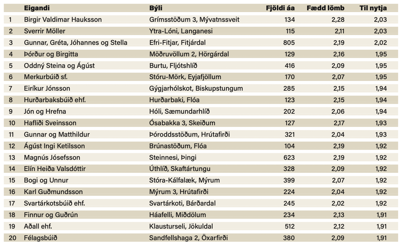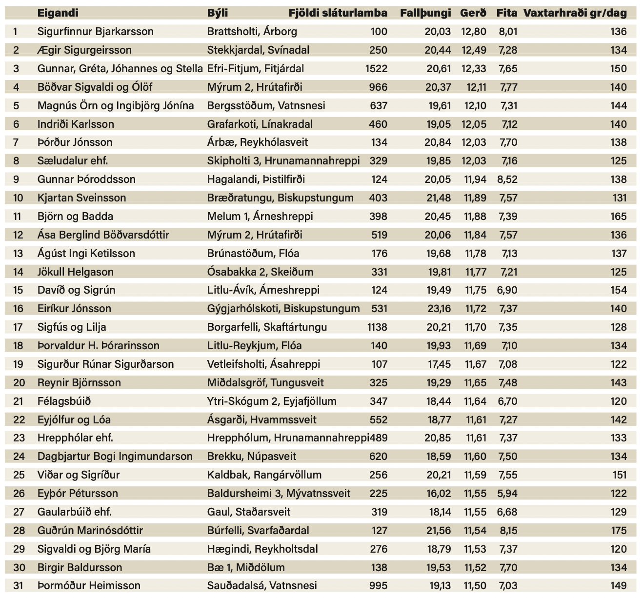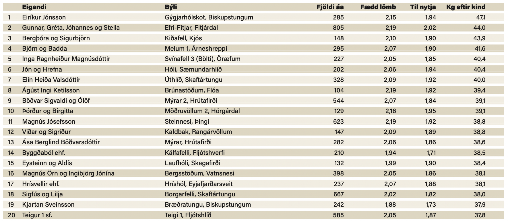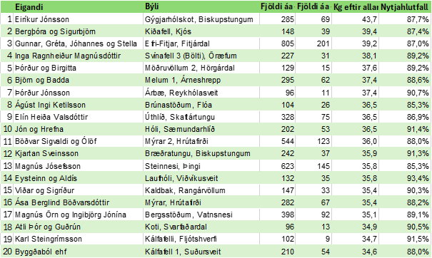 Langefst stendur Gýgjarhólskot í Biskupstungum með 47,1 kg. Þetta bú hefur skipað efsta sætið samfellt frá árinu 2015 og alltaf náð meira en 40 kg eftir ána.