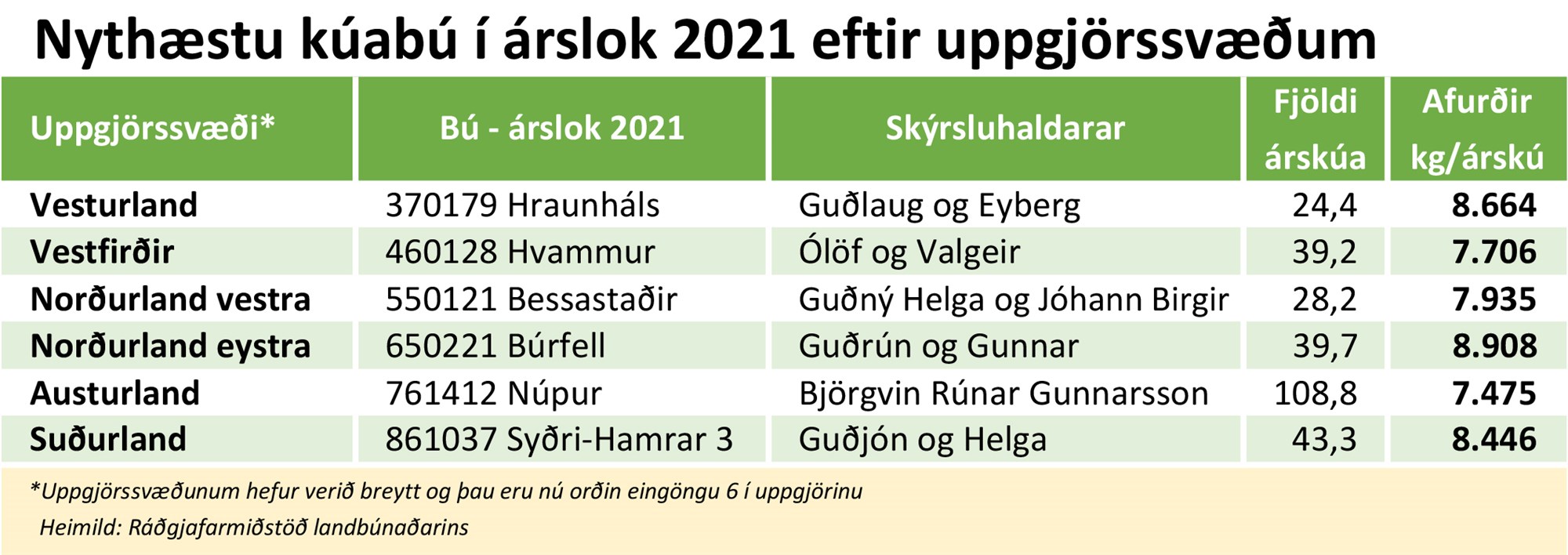 Annað árið í röð reyndist mest meðalnyt eftir árskú vera hjá Guðrúnu Marinósdóttur og Gunnari Þór Þórissyni á Búrfelli í Svarfaðardal. Nyt eftir árskú endaði þar í 8.908 kg á árinu 2021 sem er aukning um 329 kg frá fyrra ári. Á Búrfelli er að finna legubásafjós með mjaltaþjóni sem tekið var í notkun vorið 2018. Frá þeim tíma hafa afurðir aukist jafnt og þétt og sér í raun ekki fyrir endann á því.