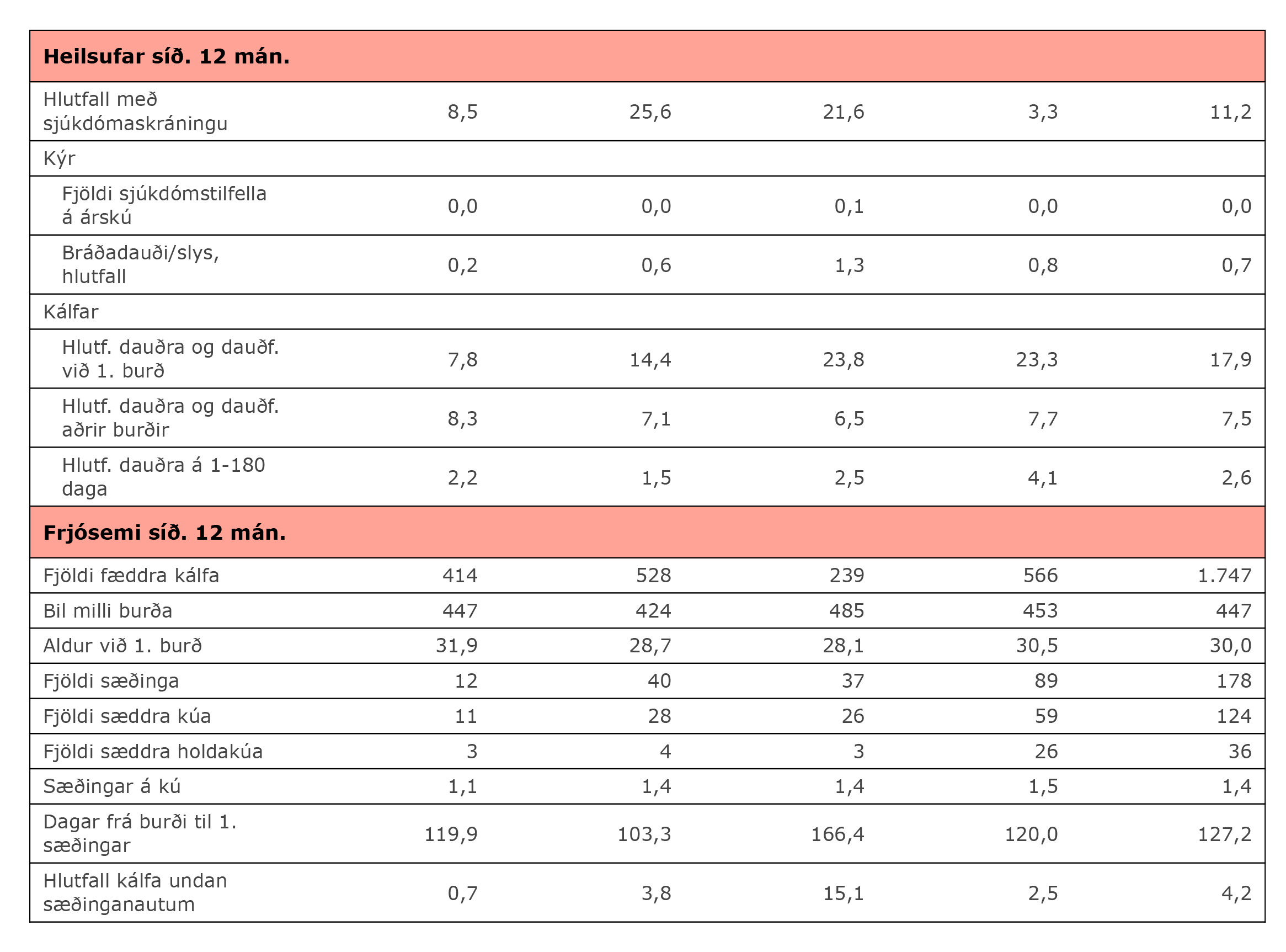 Eins og áður sagði fæddust 1.747 kálfar á þessum búum á árinu 2018 og reiknast meðalbil milli burða 453 dagar. Það þýðir að meðalkýrin nær ekki einum burði á ári sem hlýtur að teljast grunnforsenda þess að um arðbæran búskap sé að ræða. Þegar við bætist að hlutfall dauðfæddra kálfa við 1. burð er 17,9%, 7,5% við aðra burði og vanhöld frá 0-6 mánaða 2,6%, verður fjöldi kálfa til nytja töluvert langt innan við kálf á kú á ári.