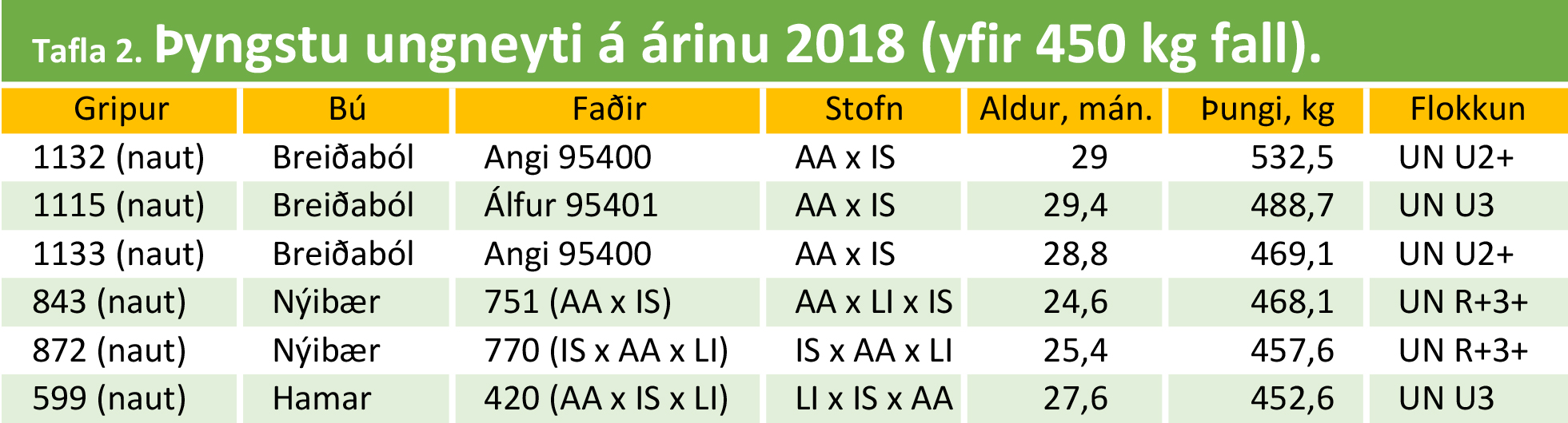 Þyngsta ungneytið sem slátrað var árinu var naut nr. 1132 á Breiðabóli á Svalbarðsströnd. Sá gripur var holdablendingur af Angus-kyni undan Anga 95400 og vóg 532,5 kg er honum var slátrað við 29 mánaða aldur. Hann flokkaðist í UN U2+. Í töflu 2 má sjá þau ungneyti sem náðu yfir 450 kg fallþunga á árinu 2018 en þau voru sex talsins og frá þremur búum, Breiðabóli á Svalbarðsströnd, Nýjabæ undir Eyjafjöllum og Hamri í Hegranesi.