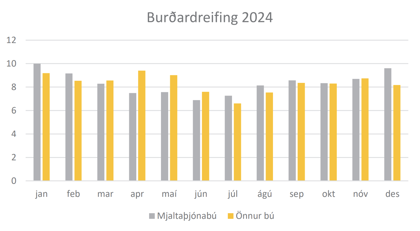 Á meðfylgjandi mynd má sjá hlutfallslega burðardreifingu eftir mánuðum á árinu 2024 skipt eftir mjaltaþjónabúum annars vegar og öðrum búum hins vegar. Þarna má sjá að burðir eru hlutfallslega flestir á vormánuðum á þeim búum sem ekki eru með mjaltaþjóna. Þannig hefur þetta verið um langa hríð enda sækja kýrnar í að bera á vorin. Þá eru burðir hlutfallslega fleiri á haustmánuðum en á t.d. sumrin en bændur vilja fremur að kýr og kvígur beri að loknu sumri m.t.t. bústjórnarlegra þátta. Á mjaltaþjónabúunum er burðardreifingin ívið jafnari og þar er ekki að sjá topp í burðartíðni á vorin en aftur á móti kemur toppur í desember og janúar. Eflaust mætti ná betri nýtingu á mjaltaþjónana með því að jafna burðardreifinguna enn frekar en kannski er eðlilegt að menn vilji ekki láta kýrnar/kvígurnar bera á sumrin þegar gróffóðuröflun stendur sem hæst. Úr því rætt er um burði er rétt að nefna aldur við fyrsta burð. Á árinu 2024 reyndist hann vera 27 mánuðir að meðaltali sem er 0,2 mánuðum lægri meðalaldur en árið áður. Það er jákvæð þróun en betur má ef duga skal. Allar rannsóknir sýna að hagkvæmasti burðaraldur er í kringum 24 mánuðir og að því ber að sjálfsögðu að stefna.