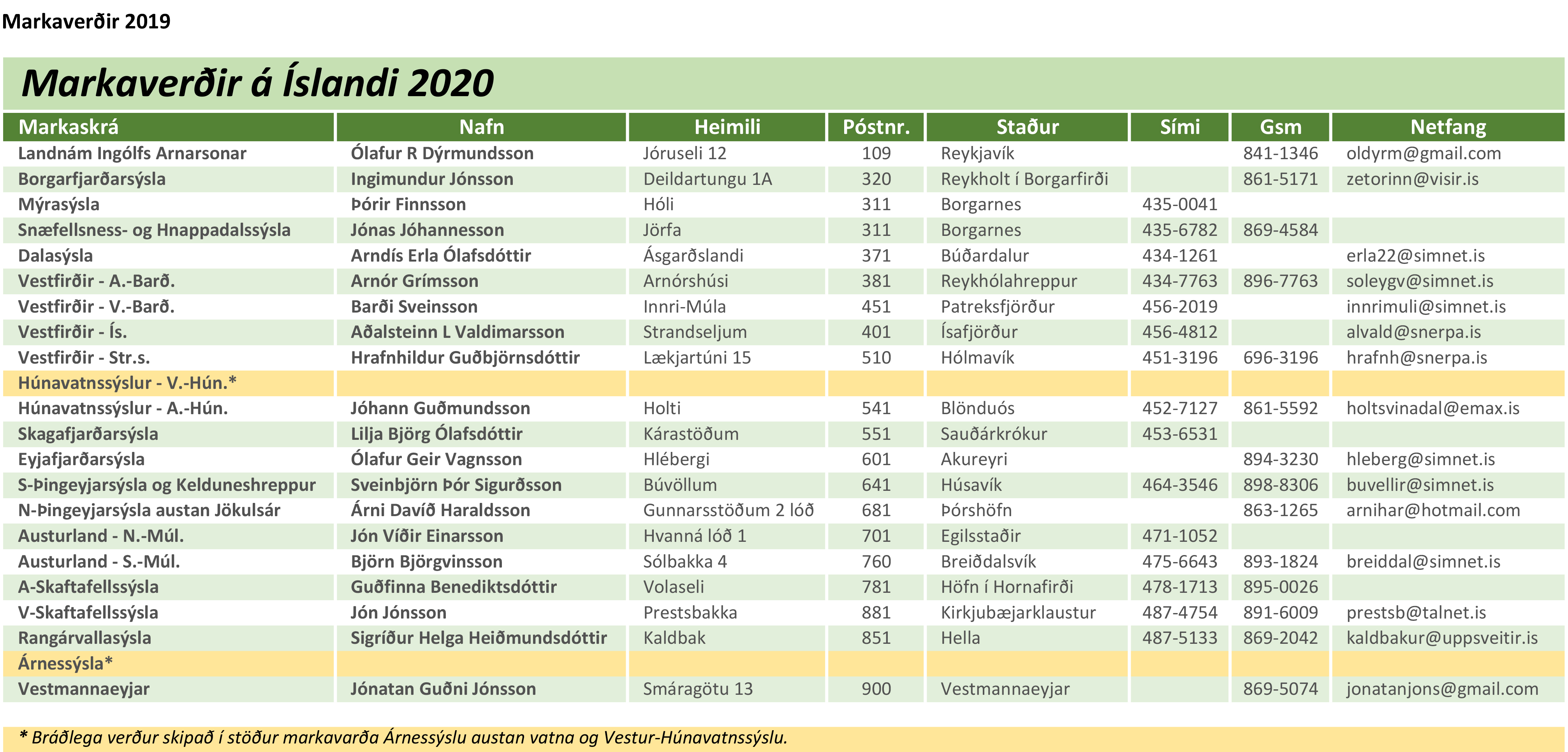 Markaverðir um land allt hafa fengið send öll þau gögn sem þeir þurfa frá Bændasamtökum Íslands til að geta hafið söfnun marka og er hún nú þegar hafin í sumum markaumdæmunum. Allir skráðir markaeigendur fá send bréf með markablöðum og leiðbeiningum og er reiknað með að flestar skráningarnar skili sér til markavarða í desember og janúar. Berist ekki bréf af einhverjum ástæðum þarf að hafa samband við viðkomandi markaverði. Þeir veita nánari upplýsingar eftir því sem þörf krefur og aðstoða við upptöku nýrra marka og bæjarnúmera. Í meðfylgjandi skrá eru póstföng og símanúmer þeirra allra og netföng flestra.