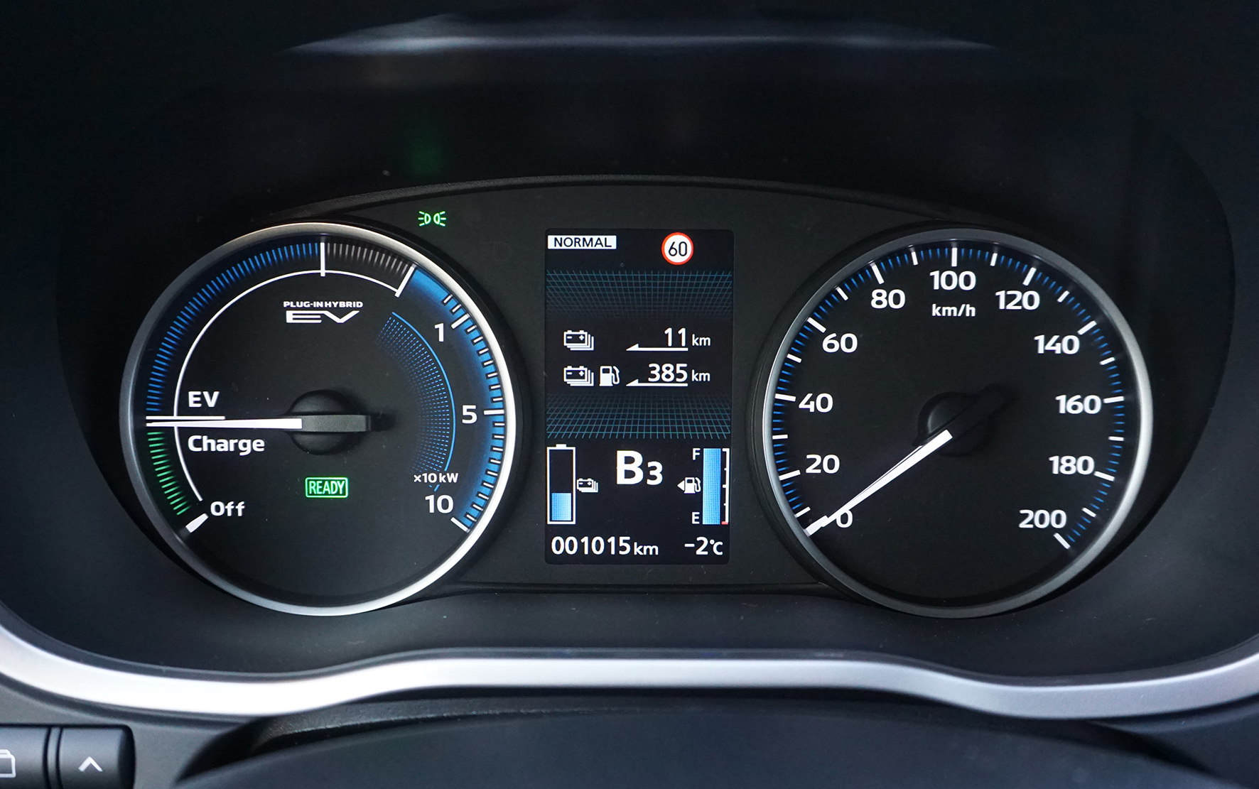 Það tók mig ekki langa stund að klára endanlega drægnina í rafmagninu. Þegar ég fékk bílinn eftir að einhverjir viðskiptavinir Heklu höfðu prófað bílinn yfir daginn var uppgefin drægni á rafmagninu 11 km, en uppgefin hámarksdrægni á rafmagninu einu er 45 km við bestu aðstæður. Því fór nánast allur aksturinn fram á bensínmótornum.