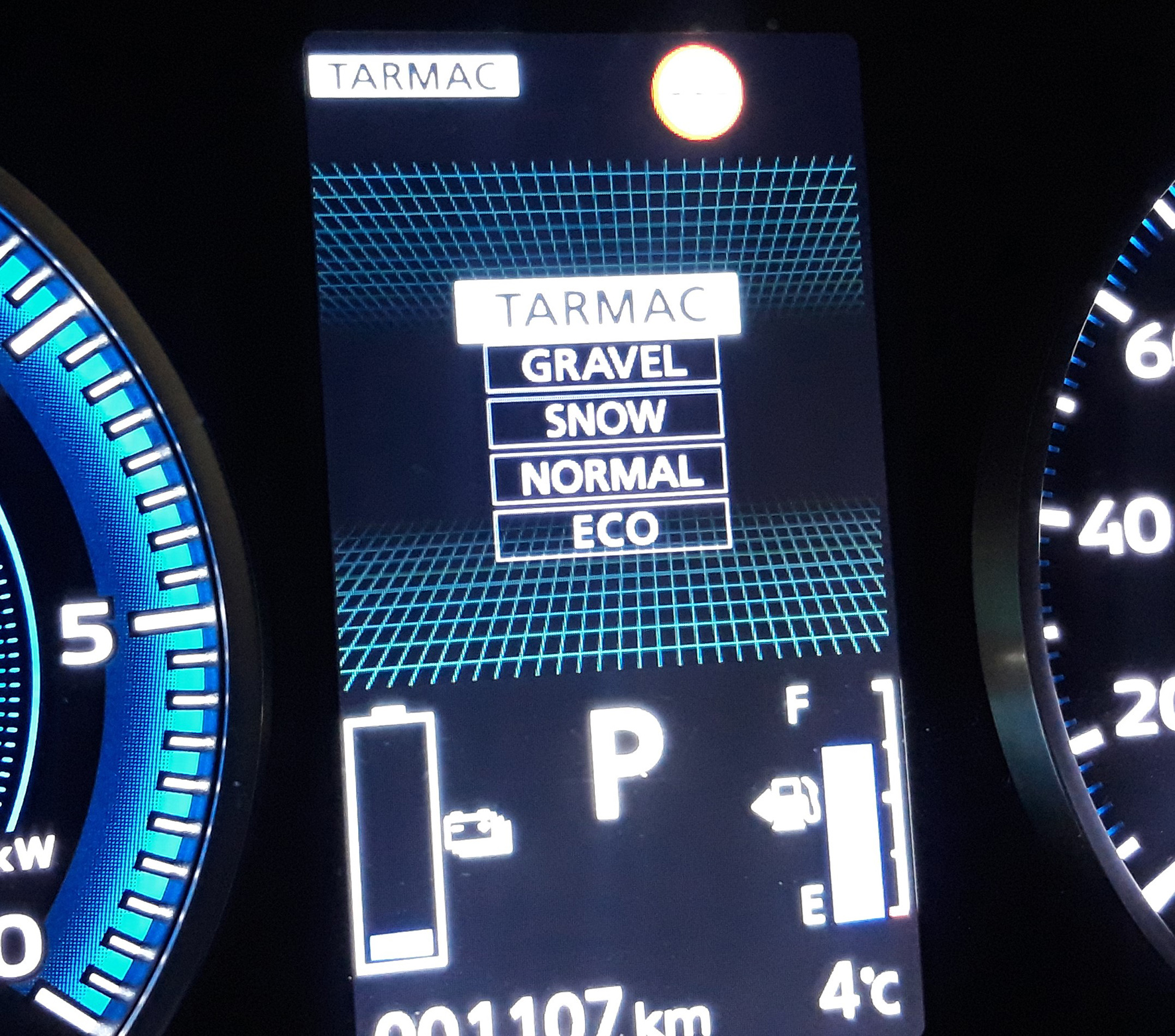 Sætin eru góð og gott að ná til allra stjórntækja. Hægt er að velja á milli fimm mismunandi stillinga til að keyra bílinn í, Tarmac, Gravel, Snow, Normal og Eco. Mér fannst skemmtilegasta snerpan í bílnum þegar stillt var á Tarmac, en rafmagnsmótorinn hélst lengst á ef stillt var á Normal eða Eco.