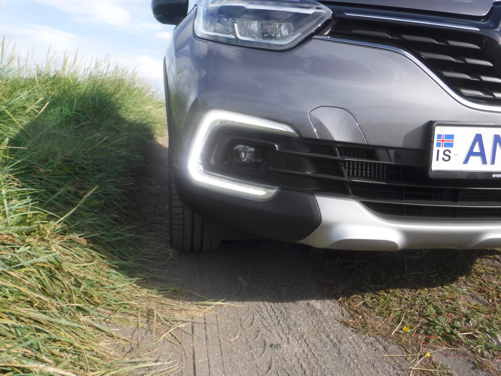 Í nýja bílnum er búið að færa númerafestinguna ofar sem gefur framendanum upplyftingu. Einnig eru dagljósin að framan orðin skærari, lýsa betur og það besta er að nú er bíllinn með kveikt á ökuljósunum að framan. Ég hef aldrei skilið af hverju bílar sem eru bara með dagljós að framan eru einfaldlega leyfðir í umferð þar sem lög kveða á um að ljósaskylda sé allan hringinn. Ég efa að kvörtun mín á varadekksleysi fyrri bílsins hafi orðið til þess að nú er komið varadekk í Captur, enda býður íslenskt vegakerfi ekki upp á að aka um án varadekks.