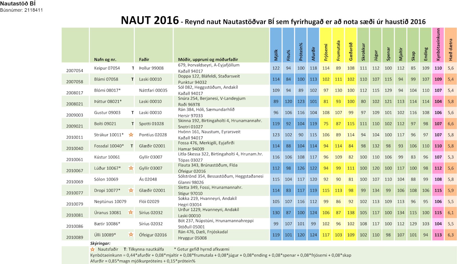 Þarna eru á ferðinni geysilega öflug naut sem sést best á heildareinkunn þeirra en sem dæmi standa bæði Dropi 10077 og Úranus 10081 með 115 sem skipar þeim í hóp allra hæstu nauta. Sem stendur er Bambi 08049 efstur með 119 í heildareinkunn og næstir koma Koli 06003 með 118 og Birtingur 05043 með 117. Dropi 10077 og Úranus 10081 koma næst á eftir þeim.