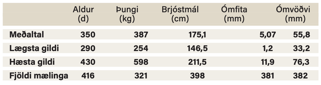 Meðaltöl, lægstu og hæstu gildi má finna í töflu 1. Mældur ómvöðvi var á bilinu 33,2 mm til 76,3 mm og dreifingin var svipuð og í Angus gripum í Noregi. Fita var einnig svipuð og hjá norsku gripunum en hún var á bilinu 1,2 mm til 11,9 mm en einhverjar líkur eru á því að tvöfalt fitulag sé viðvarandi í stofninum. Eðlilegt er að það sé mikill breytileiki í ómfitu.