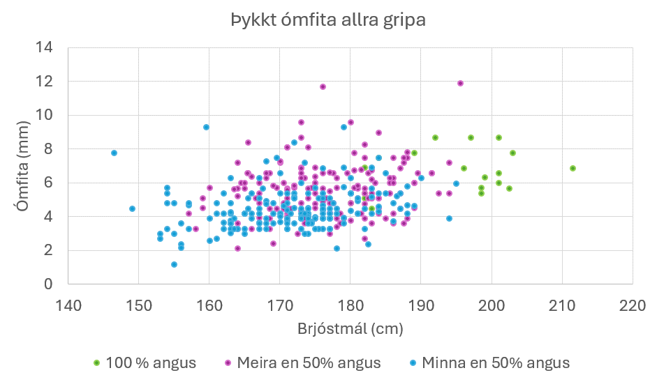 Við að nota gögn um hlutfall búfjárkyns gripa úr Huppu.is má skoða dreifingu mælinga með mismunandi hlutfall af Anguskyni. Á mynd 2 eru allar mælingar á ómfitu miðaðar við brjóstmál. Niðurstöður sýna að búfjárstofn hefur ekki marktæk áhrif á þykkt fitulags en einhver tilhneiging sást að með auknu Angus-hlutfalli ykist þykkt fitulags. Sterk jákvæð fylgni er milli þykktar fitulags á hryggvöðva og innanvöðvafitu og má því áætla að einhverju leyti um fitusprengingu. Í Noregi er spáð fyrir um innanvöðvafitu (fitusprengingu) með sérstöku reiknilíkani en hugbúnaðurinn er ekki enn kominn í ómtækið sem við notum.