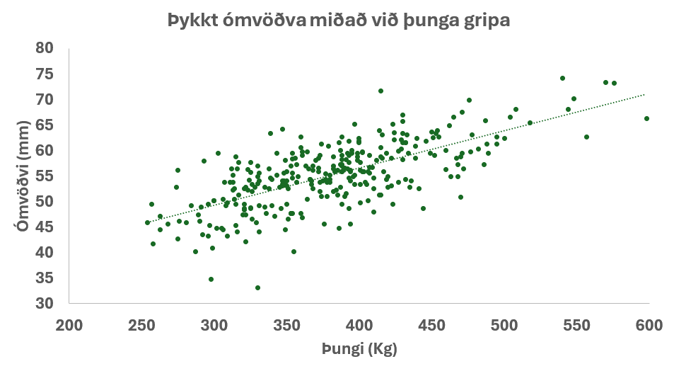 Þungaskráning var á meirihluta gripanna en þungi hefur sterka jákvæða fylgni við ómvöðvann eins og sést á halla aðhvarfslínunnar á mynd 1. Þessar niðurstöður eru í samræmi við það sem þekkist erlendis og í sauðfjárrækt hérlendis. Þar sem var ekki aðstaða á öllum stöðum til að vigta gripi var ákveðið að taka brjóstmál af öllum gripum. Það gerði okkur kleift að kanna samband brjóstmáls og þunga. Brjóstmálið var tekið með hefðbundnu málbandi sem var sótt undir kvið gripanna með heimatilbúnum krók, kústskafti með krók af herðatré.