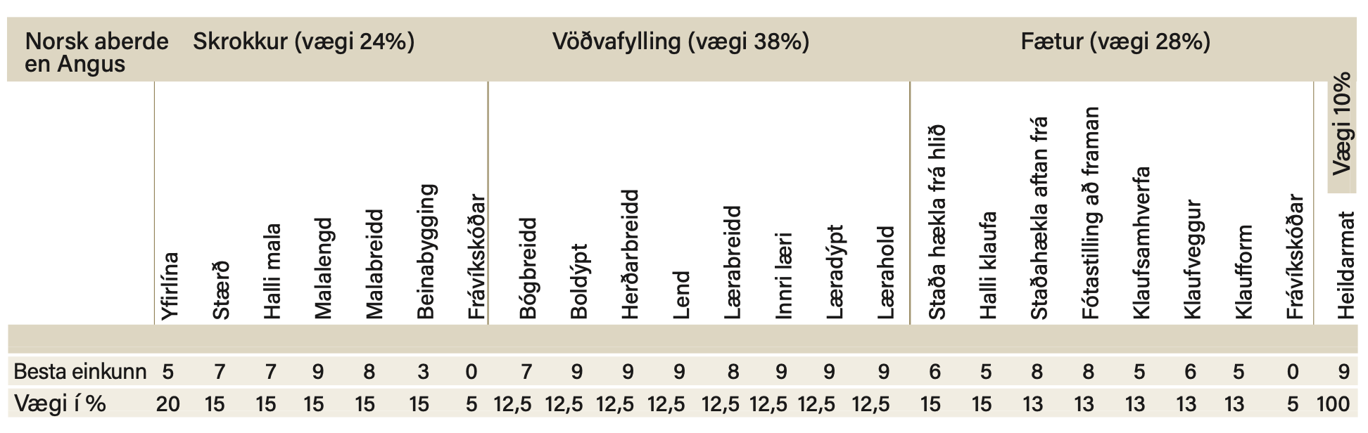 Útlitsdómurinn minnir mikið á þann dóm sem notaður er hérlendis á mjólkurkýr. Ákveðnir eiginleikar eru metnir á skalanum 1-9 en breytilegt hvaða gildi er best og er skalinn ólíkur milli kúakynja. Í töflu 1 má sjá hvaða eiginleikar eru dæmdir og hver er besta einkunnin fyrir hvern eiginleika hjá Angus kyninu.