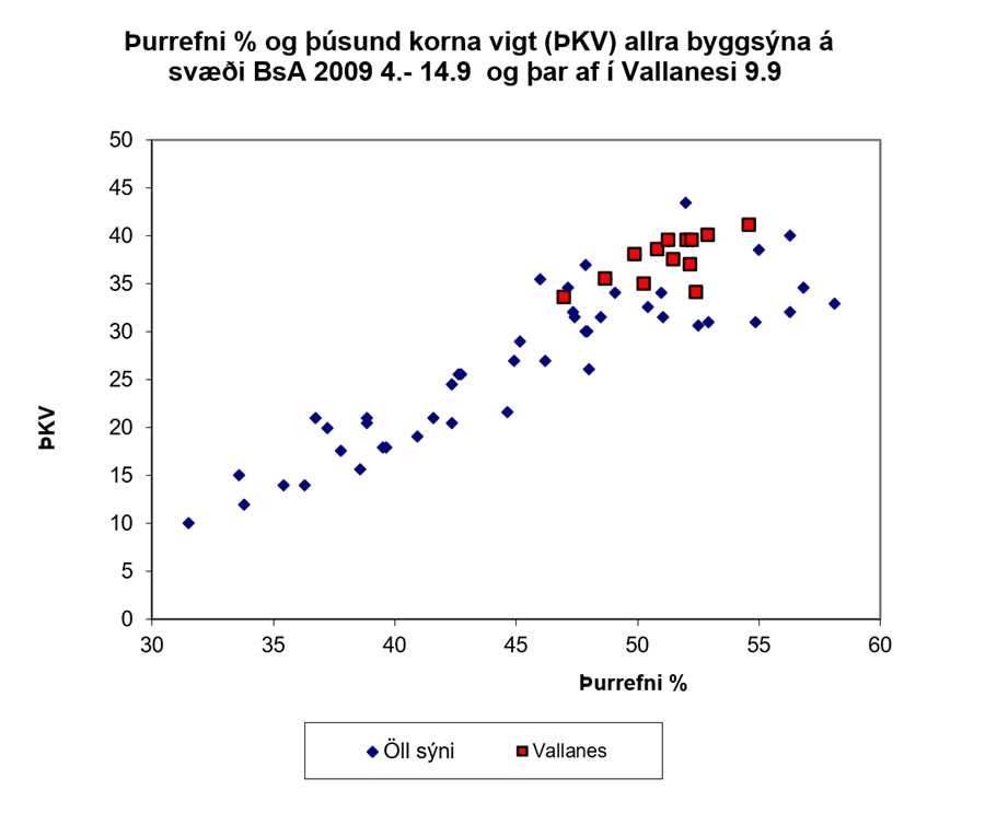 Á málþingi Fagráðs í lífrænum landbúnaði nýverið kom fram hversu mikið er í húfi fyrir mannkynið að varðveita heilbrigði jarðvegs fyrir komandi kynslóðir, s.s. til að sporna gegn áhrifum hlýnandi loftslags en heilbrigður jarðvegur getur bundið mikið kolefni. Meðal fyrirlesara var Austurríkismaðurinn Gerald Dunst, sem er sérfræðingur í jarðgerð og lífkolum. Austurríki er það land sem hvað mestum árangri hefur náð við útbreiðslu lífræns landbúnaðar í Evrópu og gegnir greinin mikilvægu hlutverki þar í landi umhverfislega en einnig til verðmætasköpunar. Fram kom að lífrænir bændur eru að skila meiri uppskeru þar í landi. Uppskerumagn hér á landi hefur auk þess verið sambærilegt eða meira í lífrænni kornrækt skv. mælingum og samantektum sem gerðar hafa verið. Þórarinn Lárusson, f.v. ráðunautur, annaðist sýnatökur og mælingar á þurrefni og þúsundkornavigt yfir 20 ára tímabil (1994-2014) á Austurlandi og dæmi um hans útreikninga er að sjá á mynd. Línuritið er dæmigert fyrir mælingarnar yfir þetta tímabil, óháð árferði, og sýnir niðurstöðu úr sýnum sem tekin voru í fyrrihluta september 2009 en sýnin úr lífrænni ræktun í Vallanesi er að sjá efst á myndinni.