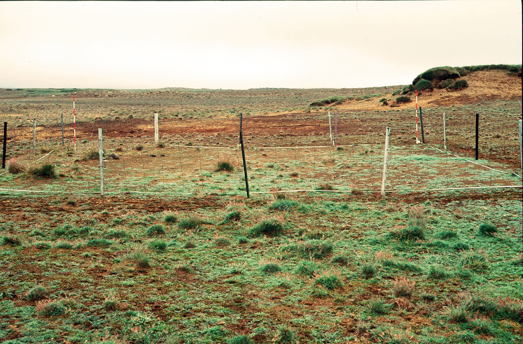 3. mynd. Áhrif traðks á moldum við Heygil. Bæði utan og innan reits (R18) er klóelfting áberandi. Utan reits er mikið traðk og verulegt landnám merkjanlegt, grashnubbar eru margir. Innan reits er yfirborð jafnara, klóelfting er þar ríkjandi og grashnubbar eru fáir en stórir (ljósmynd 5. ágúst 1999).