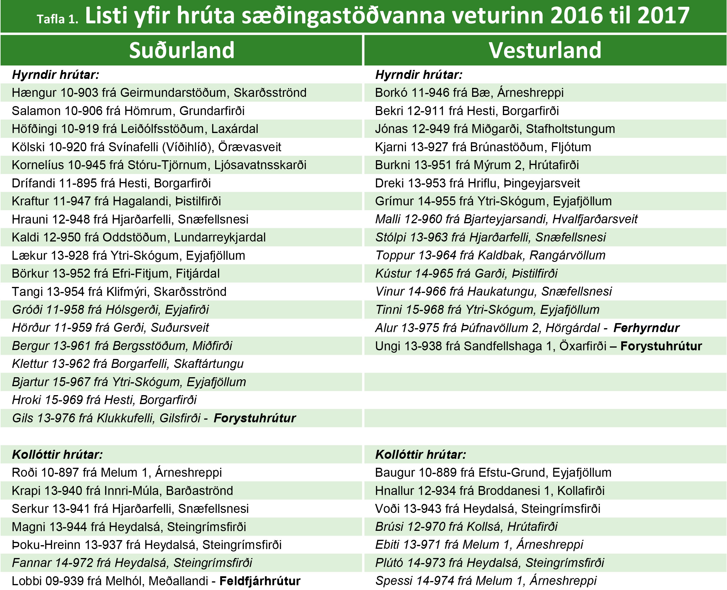 Í skránni eru 48 hrútar. Hyrndir hrútar eru 31 og þar af 12 nýir. Kollóttir hrútar eru 13 og þar af 5 nýir. Þetta er sami fjöldi nýrra hrúta og teknir voru inn á síðasta ári í þessa flokka. Áfram er á stöð feldfjárhrúturinn Lobbi 09-939. Þá eru tveir forystuhrútar í hópnum og annar þeirra er nýr á stöð (Gils 13-976). Síðan var tekinn inn glæsilegur ferhyrndur hrútur, Alur 13-975 frá Þúfnavöllum 2. Í töflu 1 má sjá lista yfir hrútakostinn og staðsetningu þeirra í vetur, en hluti þeirra dvelur á Sauðfjársæðingastöð Suðurlands í Þorleifskoti og hluti þeirra á Sauðfjársæðingastöð Vesturlands í Borgarnesi. Nýju hrútarnir eru listaðir upp á eftir reyndu hrútunum í töflunni og eru skáletraðir.