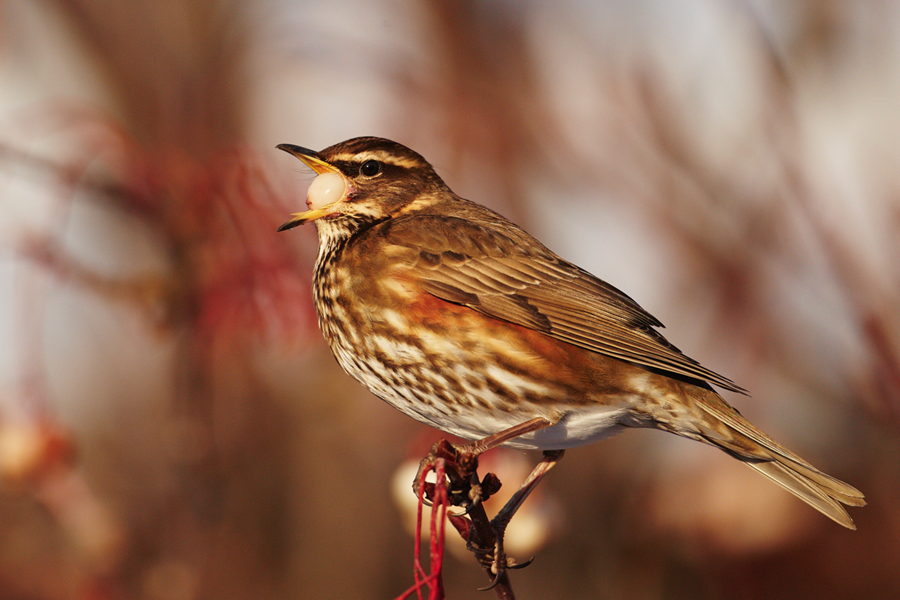 Skógarþröstur er einn algengasti fuglinn í skóglendi og í byggð. Það er ekki óalgengt að á þessum stöðum séu þeir með fyrstu fuglunum sem taka á móti manni. Hann er að mestu leyti farfugl en engu að síður er talsvert magn af þeim sem halda sig hérna yfir veturinn. Þeir eru félagslyndir utan varptíma og koma gjarnan í stórum hópum sem ganga yfir landið. Þá skyndilega fyllast skóglendi og garðar af skógarþröstum sem byrja strax að syngja af miklu kappi. Hans helsta kjörlendi eru birkiskógar og þar getur varpþéttleikinn þeirra orðið mjög mikill. Hann er afkastamikill varpfugl og þrátt fyrir okkar stutta sumar ná þeir að verpa tvisvar til þrisvar yfir sumarið, 4-6 eggjum í senn. Yfir sumar og varptíma borða þeir helst skordýr en síðsumars og á haustin sækja þeir í alls konar ber. Það getur farið ansi vel um þá ef þeir finna sér góðan rifsberjarunna og er hætta á að lítið verði eftir af uppskerunni ef þeir fá að sitja um hana óáreittir. Þegar líður á haustið sækja þeir einnig í reyniber og er skógarþrösturinn á myndinni við það að gleypa ber af koparreyni.