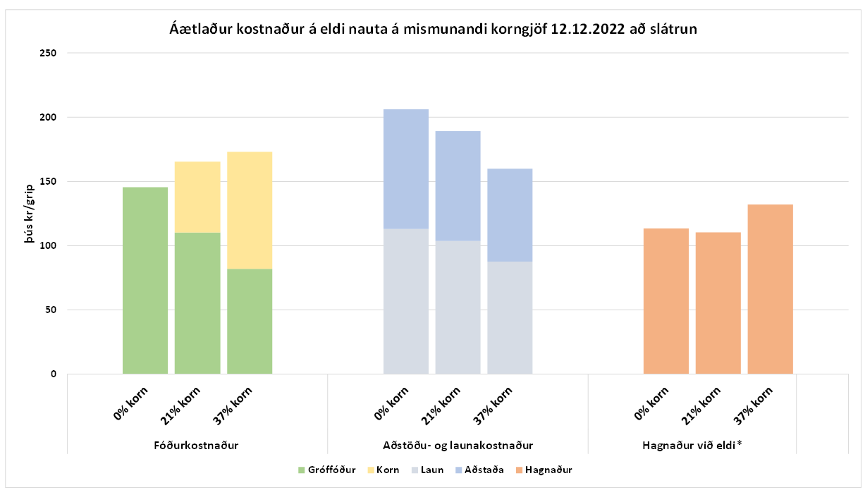 Heildarfóðurkostnaður óx með aukinni korngjöf vegna hærra verðs á korni samanborið við gróffóður. Á móti kemur að kostnaður vegna aðstöðu og launa er lægri við aukna korngjöf vegna lægri sláturaldurs gripa (mynd 2). Til að áætla aðstöðukostnað voru notaðar tölur um meðalbyggingakostnað úr rekstrarverkefni nautakjötsframleiðenda sem er unnið af RML. Í útreikningunum miðar launakostnaður við dagvinnutaxta sem notaður er við gerð fjárfestingaáætlana í landbúnaði (5.145 kr./klst.) en það er ljóst að raunlaun bænda er töluvert lægri. Með breyttum forsendum um aðstöðu- og launakostnað getur hagnaður við eldi breyst þónokkuð og í þessu má búast við að töluverður breytileiki sé milli búa.