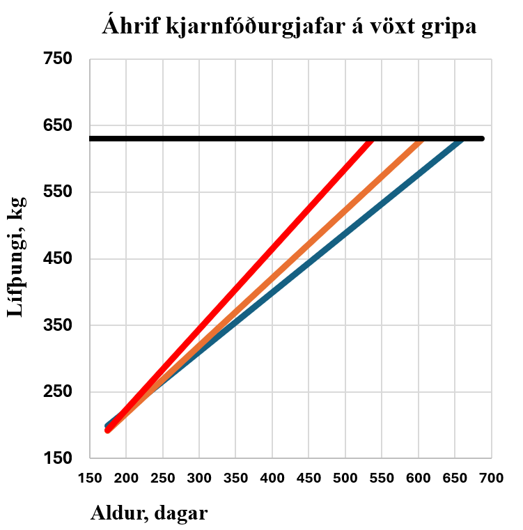 Mynd 1. Áhrif af korngjöf á vöxt gripa og eldistíma, leiðrétt að 630 kg lífþunga.