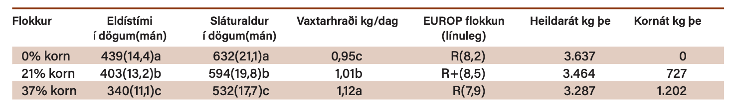 Tafla 1. Áhrif af mismunandi korngjöf á eldístíma, sláturaldur, vaxtarhraða, EUROP-flokkun og fóðurát á grip. Mismunandi upplyftir stafir sýna marktækan mun milli fóðurflokka.