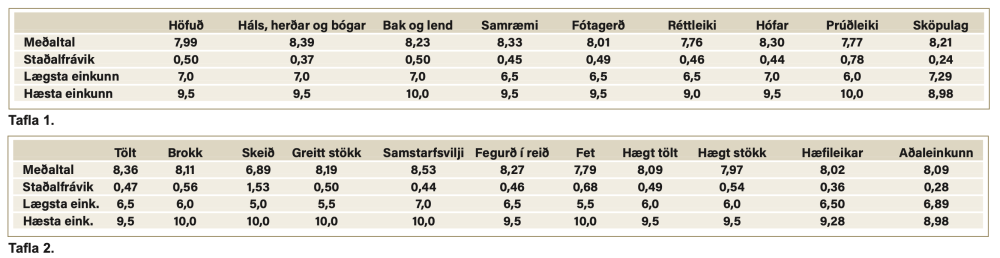 Í töflum nr. 1 og 2 sem fylgja má sjá meðaltöl og breytileika í einkunnagjöf allra eiginleika í sköpulagi og hæfileikum kynbótahrossa sem sýnd voru árið 2024 á Íslandi.