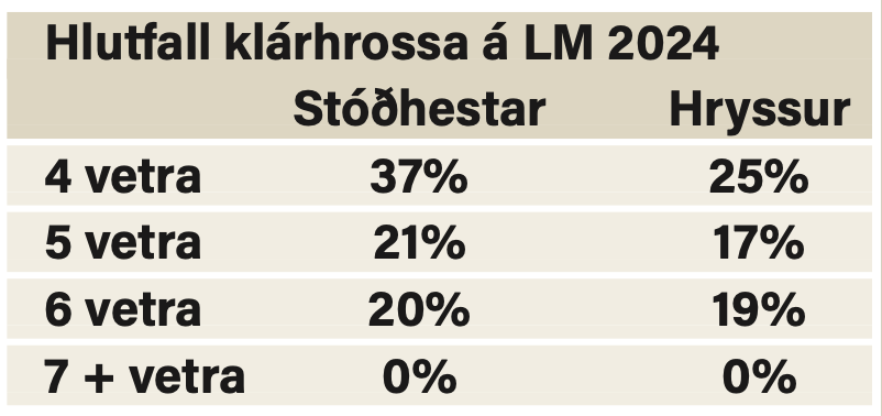 einkunnagjöf hefur ekki dregist saman. Meðaltal fyrir skeið er 6,89 ef öll hross eru tekin með í útreikningi. Ef einungis eru skoðuð hross sem hlutu skeiðeinkunn (hærra en 5,5) að þá er meðaltal fyrir skeið um 7,80 sem er líklega hæsta meðaltal sem við höfum séð fyrir skeið. Enda eru einkar margir afkvæmahestar sem eru að skila hrossum til dóms þessa dagana að gefa góða skeiðgetu. Klárhross voru 31% sýndra hrossa í ár en það er svipað hlutfall og undanfarin ár (var 32% í fyrra). Á Landsmóti voru 18% hrossa klárhross en hlutfall þeirra er töluvert mismunandi milli aldursflokka á mótinu eins og sjá má í meðfylgjandi töflu.