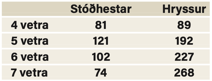 Í meðfylgjandi töflu er fjöldi hrossa sem kom til dóms í hverjum aldurs- og kynflokki á nýafstöðnu sýningarári: